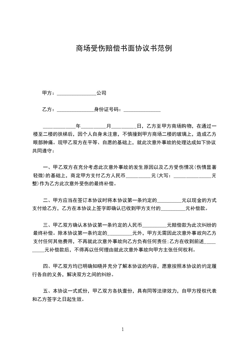 商场受伤赔偿书面协议书范例