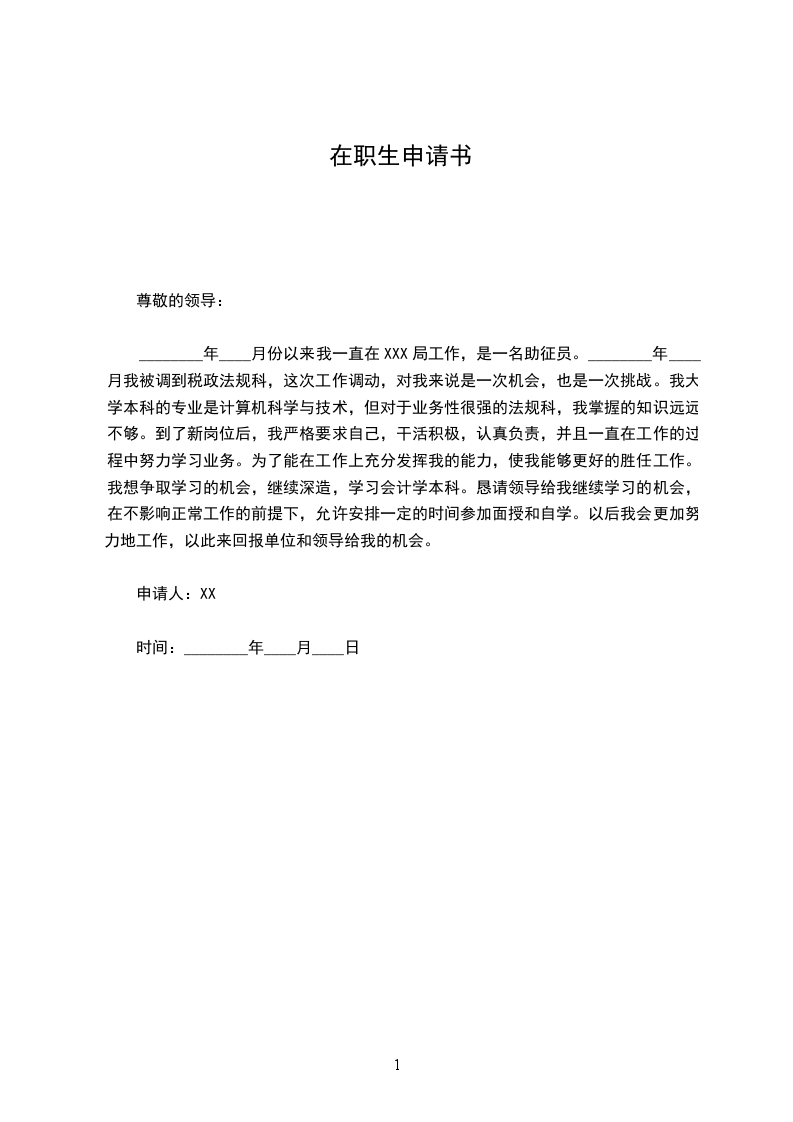 ________年____月份以来我一直在XXX局工作,是一名助征员。________年____月我被调到税政法规科,这次工作调动,对我来说是一次机会,也是一次挑战。我大学本科的专业是计算机科学与技术,但对于业务性很强的法规科,我掌握的知识远远不够。到了新岗位后,我严格要求自己,干活积极,认真负责,并且一直在工作的过程中努力学习业务。为了能在工作上充分发挥我的能力,使我能够更好的胜任工作。我想争取学习的机会,继续深造,学习会计学本科。恳请领导给我继续学习的机会,在不影响正常工作的前提下,允许安排一定的时间参加面授和自学。以后我会更加努力地工作,以此来回报单位和领导给我的机会。