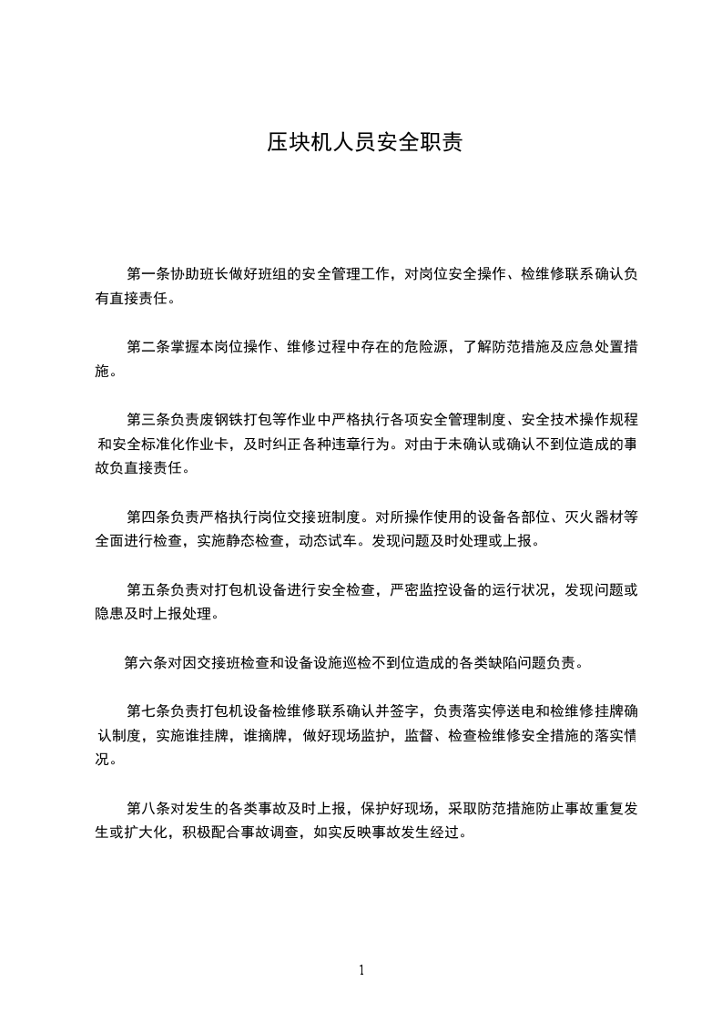 第三条负责废钢铁打包等作业中严格执行各项安全管理制度、安全技术操作规程和安全标准化作业卡,及时纠正各种违章行为。对由于未确认或确认不到位造成的事故负直接责任。