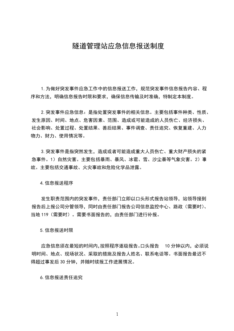 1.为做好突发事件应急工作中的信息报送工作,规范突发事件信息报告内容、程序和方法,明确信息报告时限和要求,确保信息传输及时准确,特制定本制度。