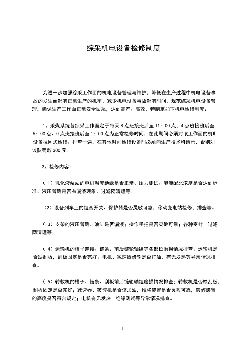 1、综采、综掘区(队)在设备投入使用前,必须编制作业规程、各工种操作规程,建立机电设备技术档案及技术资料管理制度、机电设备包机制度、电气设备试验制度、机电设备事故分析追查制度、油脂管理制度、机电设备检修维护保养制度及每月停产一次的月检制度,并保证贯彻到位,严格执行。