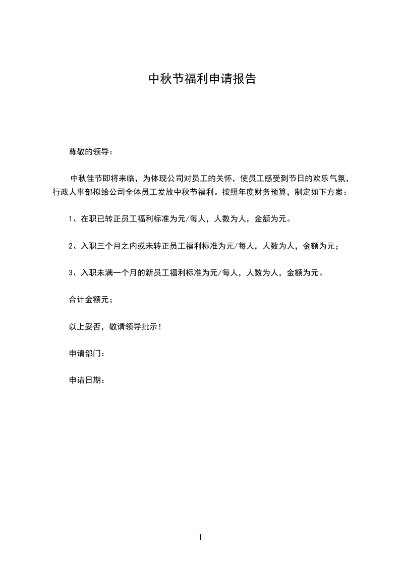2、入职三个月之内或未转正员工福利标准为_____元/每人,人数为人,金额为_____元;