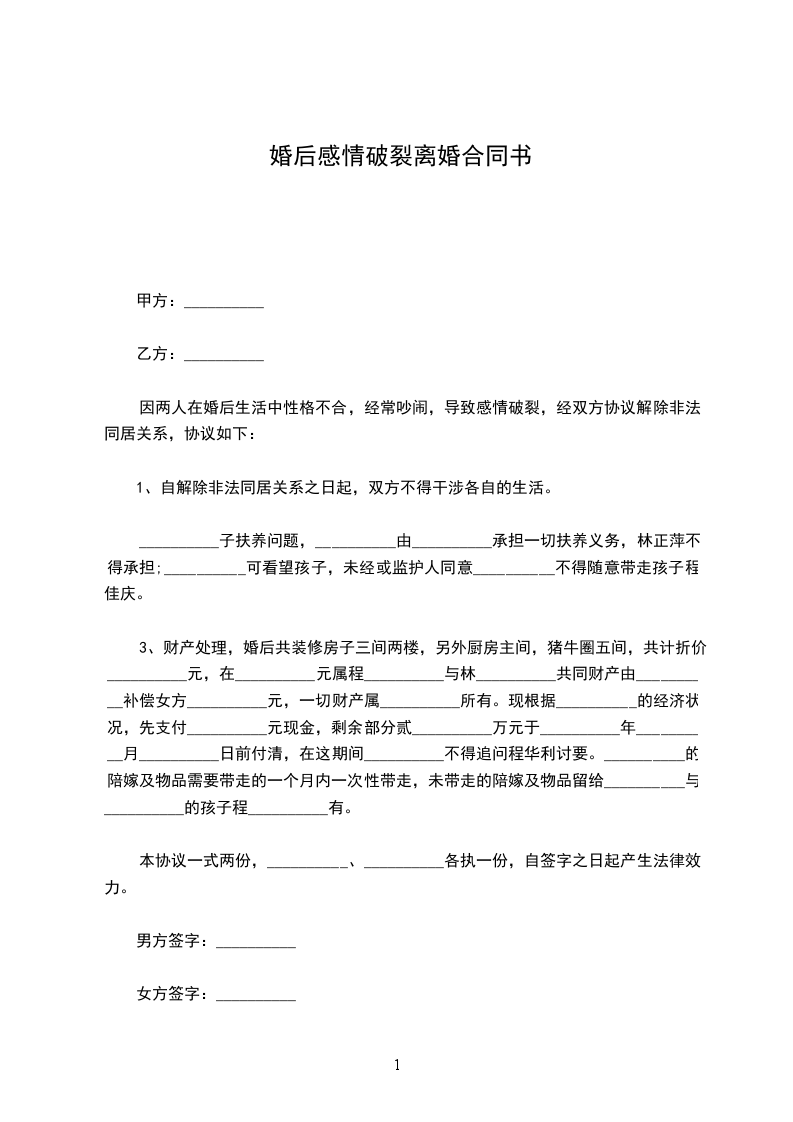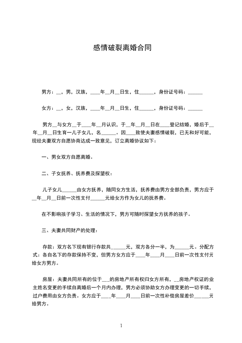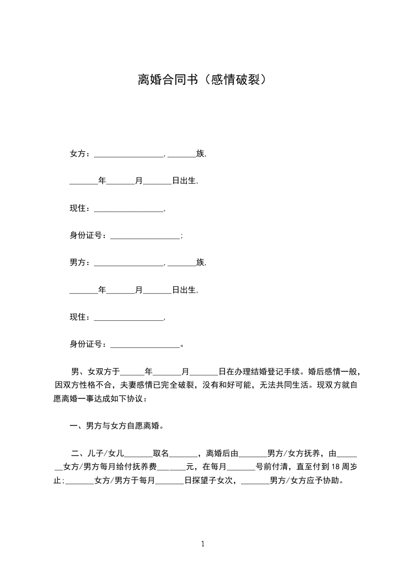 甲乙双方经自由恋爱后,于__________年__________月领取结婚证,婚后于__________年__________月生一女,取名__________。现甲乙双方因夫妻感情破裂,自愿同意协议离婚,并达成以下协议,以资双方共同遵守。