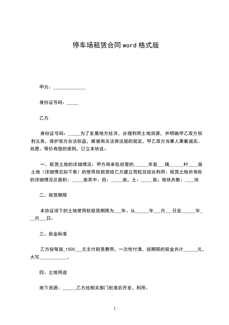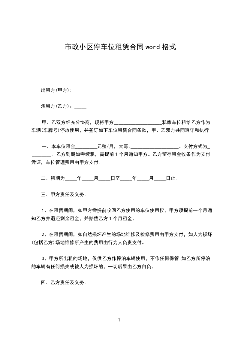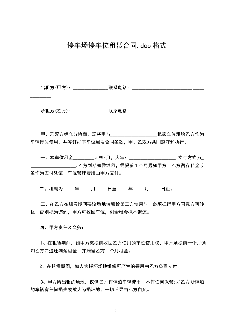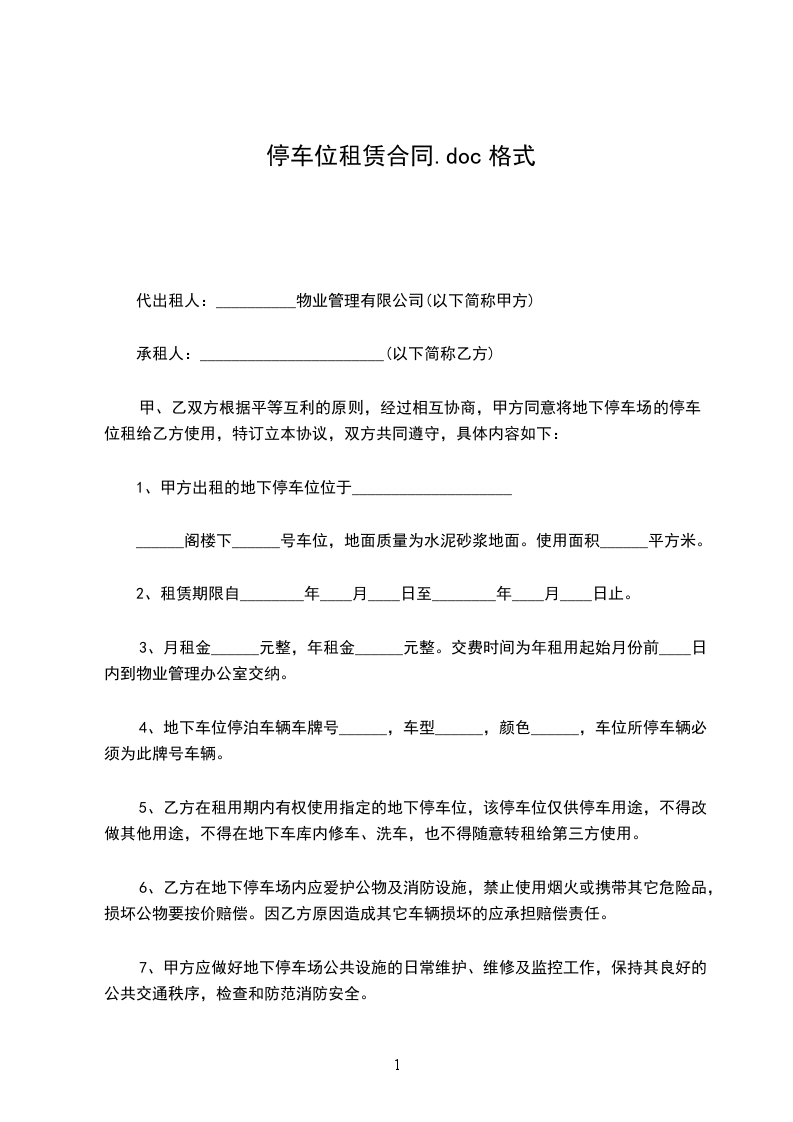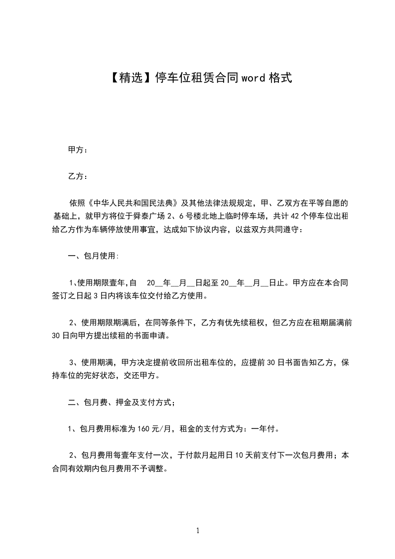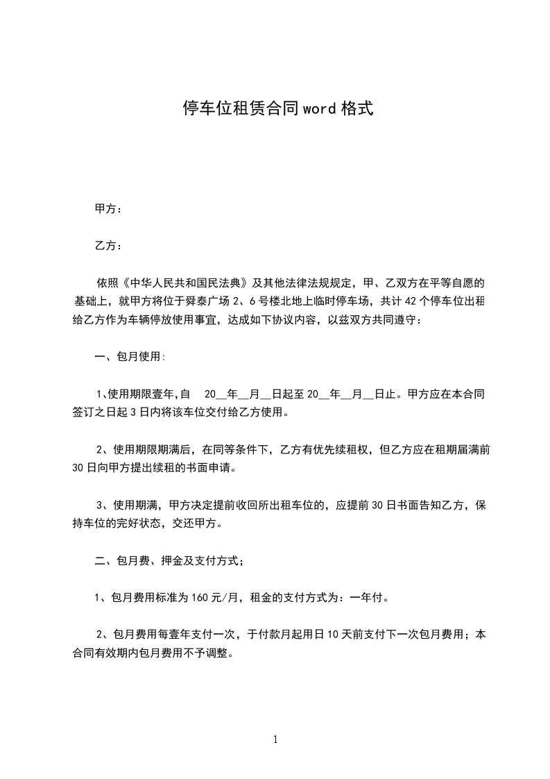 1、使用期限壹年,自20__年__月__日起至20__年__月__日止。甲方应在本合同签订之日起3日内将该车位交付给乙方使用。