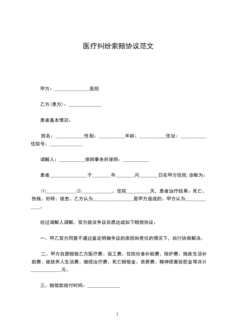 ⑴_____________⑵_____________。住院__________天,患者治疗结果:死亡、伤残、好转、痊愈。乙方认为_________________是甲方造成的。甲方认为_____________。