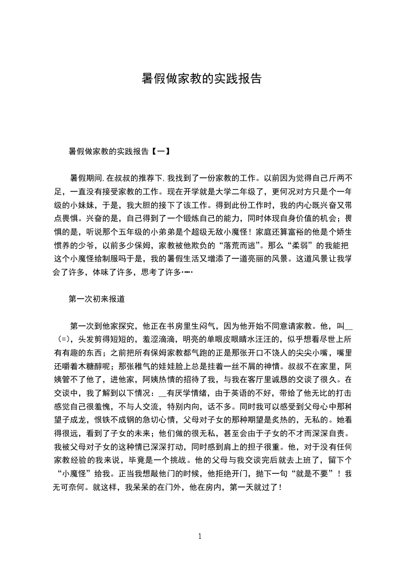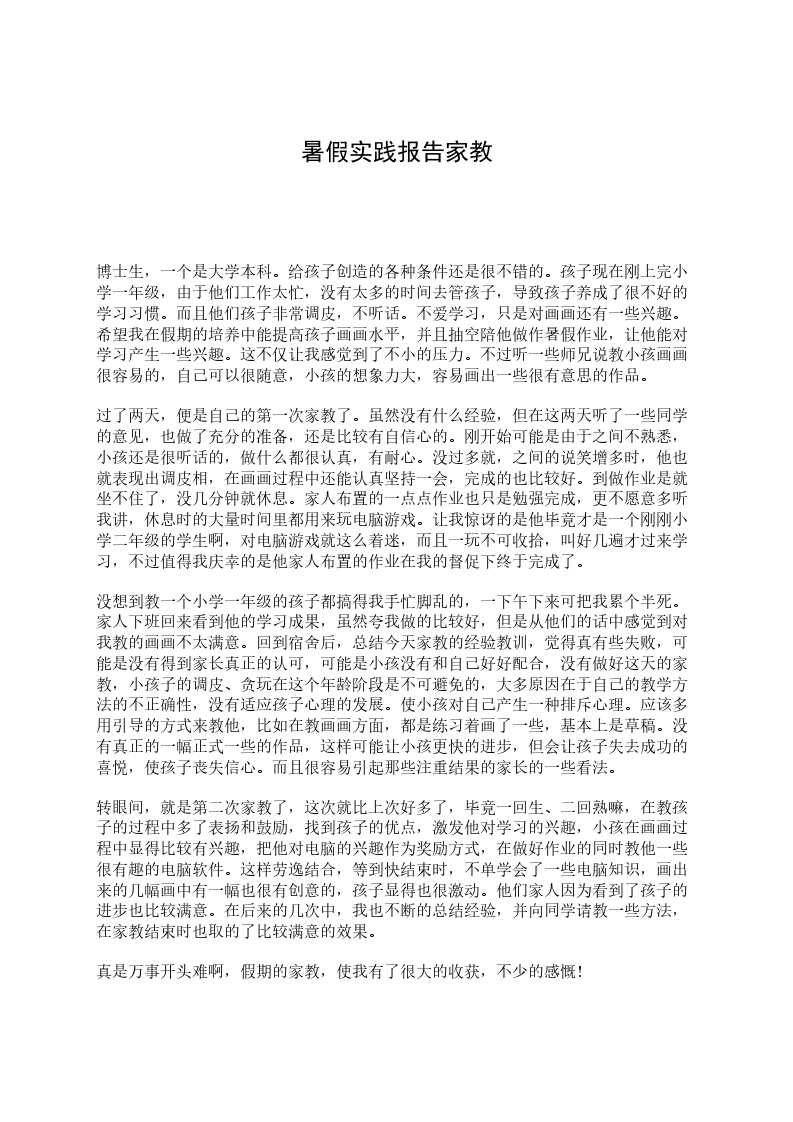 暑假期间,在叔叔的推荐下,我找到了一份家教的工作。以前因为觉得自己斤两不足,一直没有接受家教的工作。现在开学就是大学二年级了,更何况对方只是个一年级的小妹妹,于是,我大胆的接下了该工作。得到此份工作时,我的内心既兴奋又带点畏惧。兴奋的是,自己得到了一个锻炼自己的能力,同时体现自身价值的机会;畏惧的是,听说那个五年级的小弟弟是个超级无敌小魔怪!家庭还算富裕的他是个娇生惯养的少爷,以前多少保姆,家教被他欺负的“落荒而逃”。那么“柔弱”的我能把这个小魔怪给制服吗于是,我的暑假生活又增添了一道亮丽的风景。这道风景让我学会了许多,体味了许多,思考了许多……