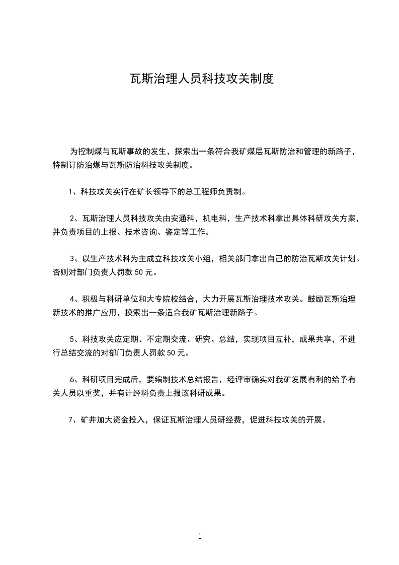 3、以生产技术科为主成立科技攻关小组,相关部门拿出自己的防治瓦斯攻关计划。否则对部门负责人罚款50元。