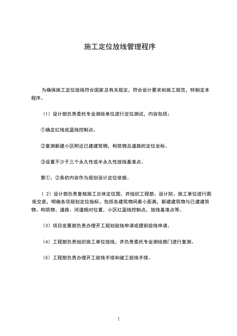 为确保施工定位放线符合国家及有关规定,符合设计要求和施工规范,特制定本程序。
