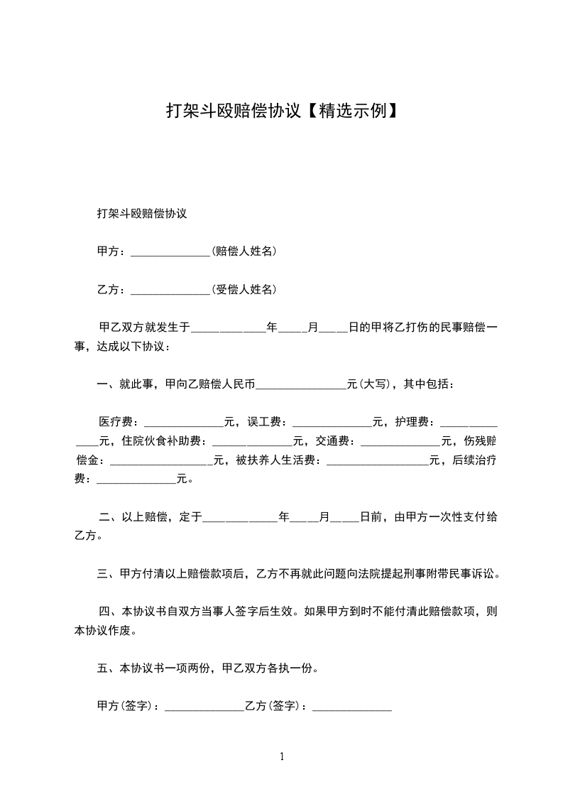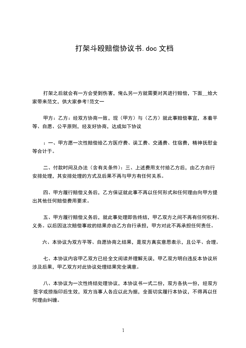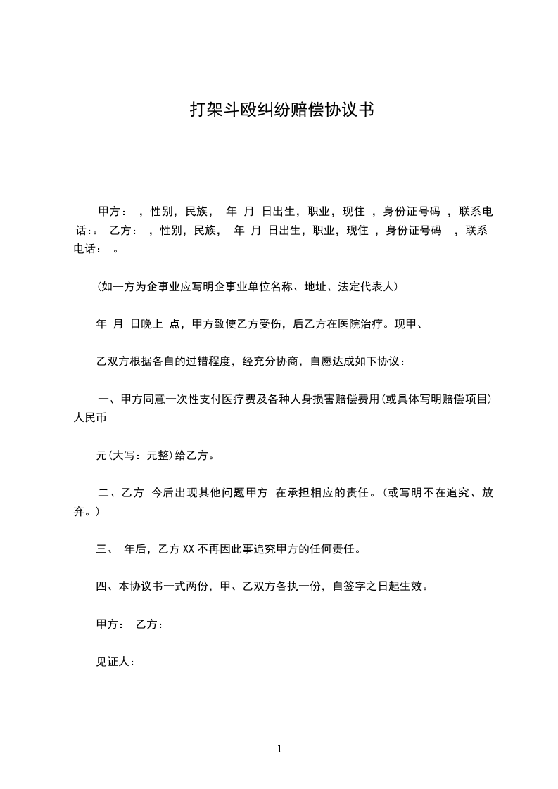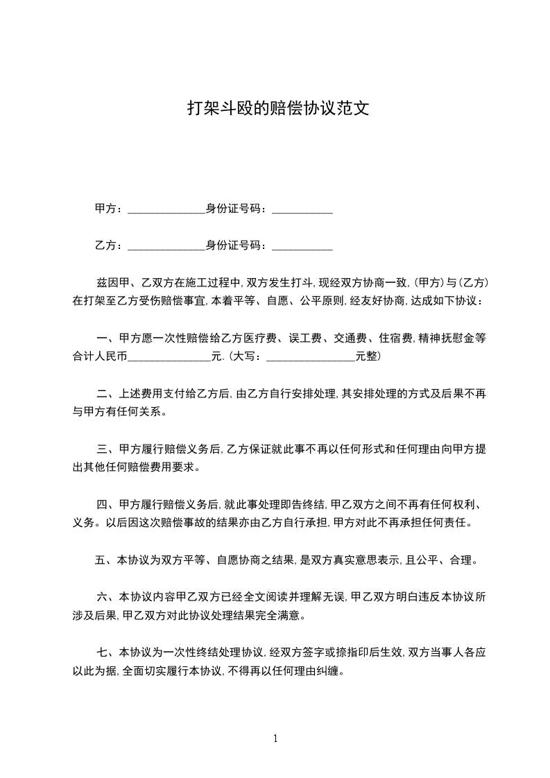兹因甲、乙双方在施工过程中,双方发生打斗,现经双方协商一致,(甲方)与(乙方)在打架至乙方受伤赔偿事宜,本着平等、自愿、公平原则,经友好协商,达成如下协议: