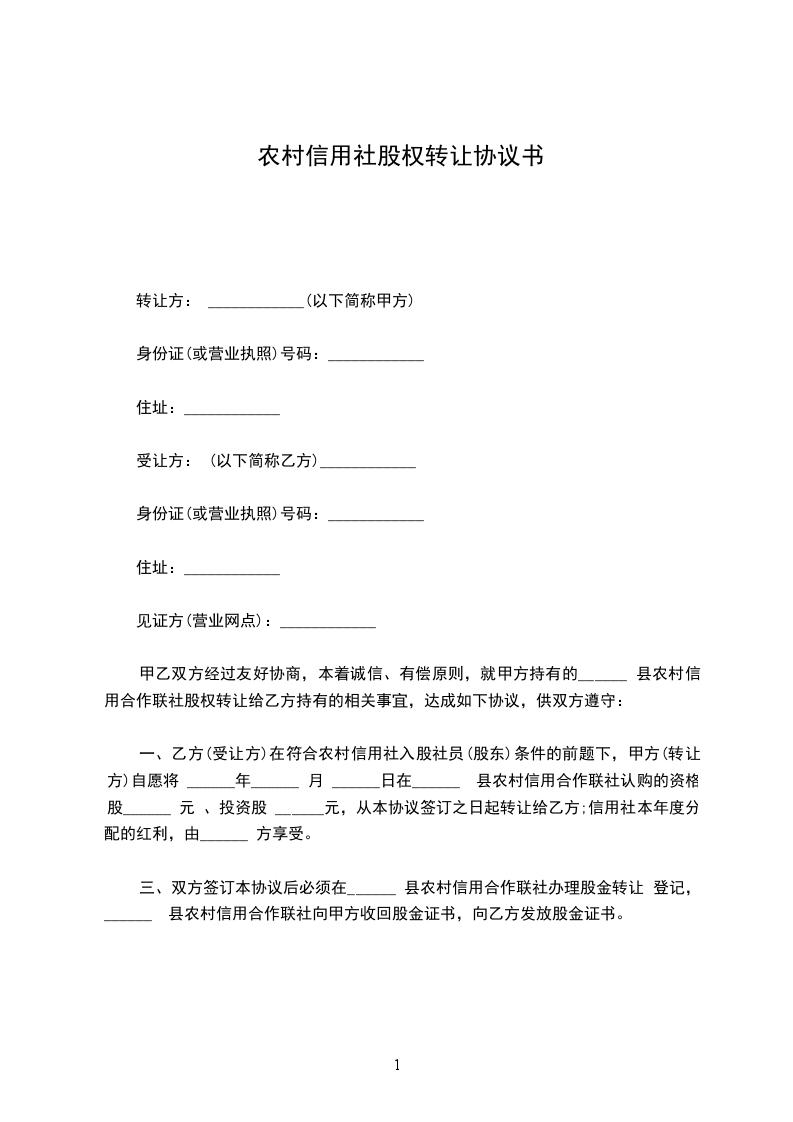 一、乙方(受让方)在符合农村信用社入股社员(股东)条件的前题下,甲方(转让方)自愿将 ______年______ 月 ______日在______ 县农村信用合作联社认购的资格股______ 元 、投资股 ______元,从本协议签订之日起转让给乙方;信用社本年度分配的红利,由______ 方享受。