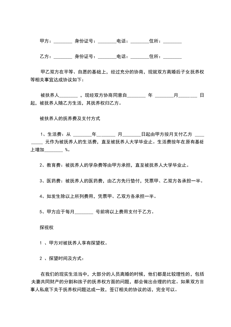 被扶养人________ ,现经双方协商同意自________ 年 ________月________ 日起,被抚养人随乙方生活,其抚养权归乙方。