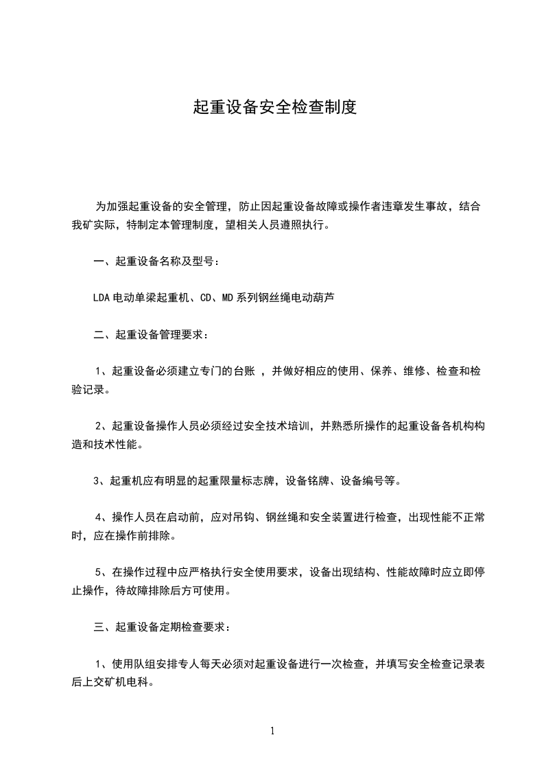 1、使用队组安排专人每天必须对起重设备进行一次检查,并填写安全检查记录表后上交矿机电科。