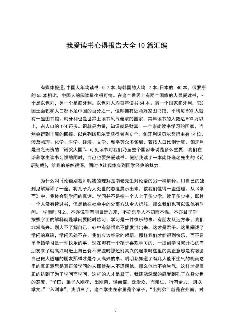 有媒体报道,中国人年均读书0.7本,与韩国的人均7本,日本的40本,俄罗斯的55本相比,中国人的阅读量少得可怜。在这个世界上有两个国家的人最爱读书,一个是以色列,另一个是匈牙利。以色列人均每年读书64本。另一个国家匈牙利,它的国土面积和人口都不足中国的百分之一,但却拥有近两万家图书馆,平均每500人就有一座图书馆。匈牙利也是世界上读书风气最浓的国家,常年读书的人数达500万以上,占人口的1/4还多。识就是力量,知识就是财富。一个崇尚读书学习的国家,当然会得到丰厚的回报。以色列诺贝尔奖获得者有8个。匈牙利诺贝尔奖得主有14位,涉及物理、化学、医学、经济、文学、和平等众多领域,若按人口比例计算,匈牙利是当之无愧的“诺奖大国”。可见读书对我们乃至整个国家来说是多么重要,我们在培养学生读书习惯的同时,自己也要热爱读书。假期我读了一本南怀瑾老先生的《论语别裁》,给我的感触很深,同时也让我体会到国学经典的魅力。