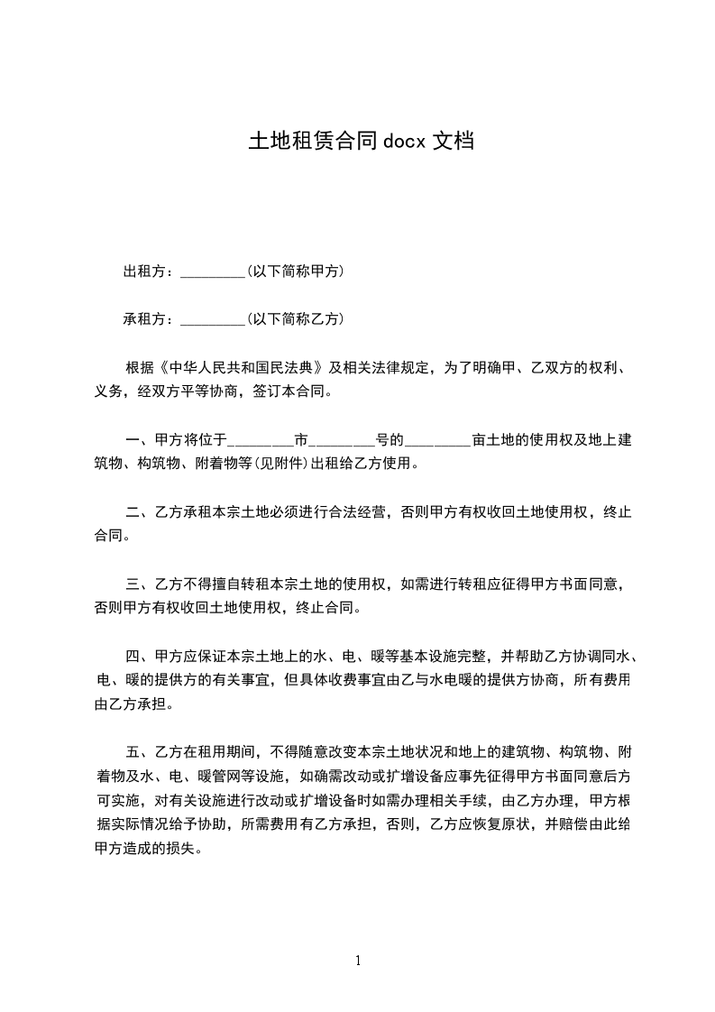 一、甲方将位于_________市_________号的_________亩土地的使用权及地上建筑物、构筑物、附着物等(见附件)出租给乙方使用。