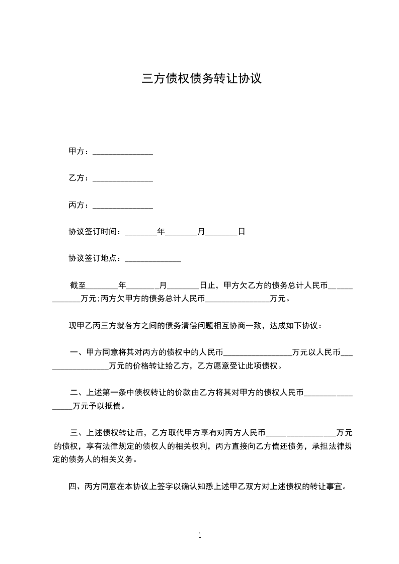 二、甲乙丙三方一致同意,丙方将针对乙方的债权共计 元人民币全部转让给甲方行使,乙方按照本协议直接付款给甲方,由乙方于 年 月 日前向甲方支付共计 元人民币。