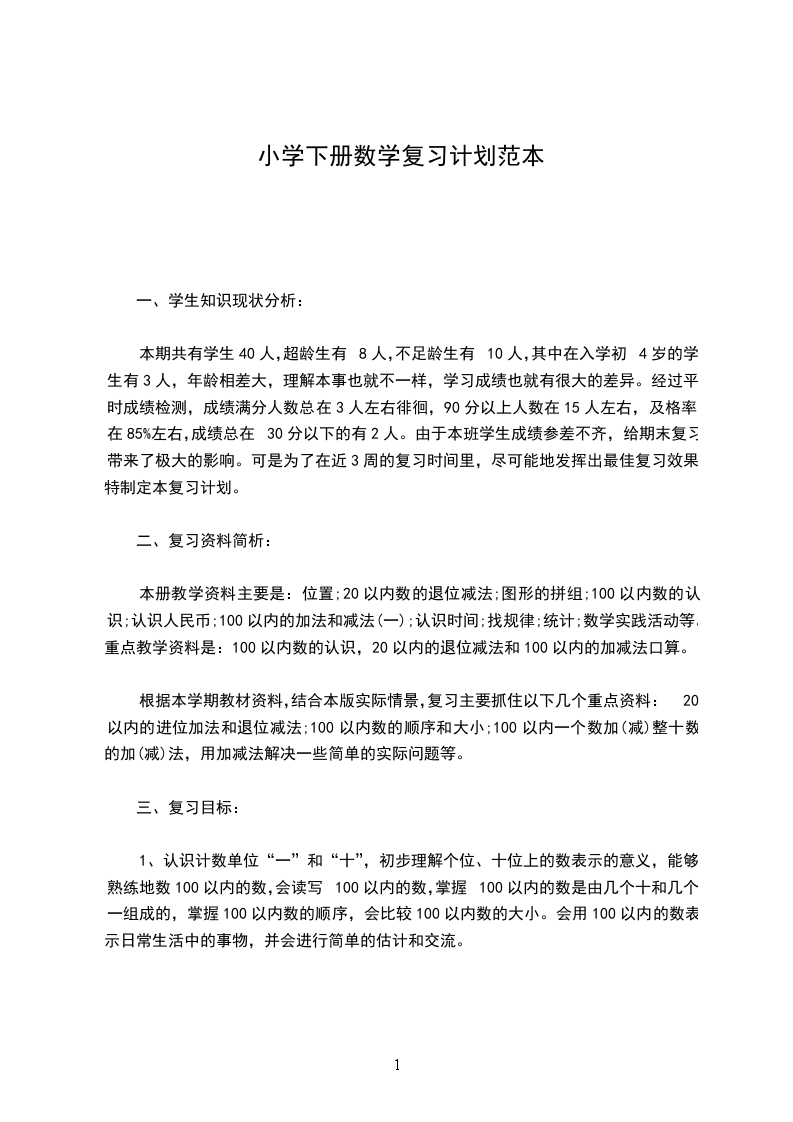 本期共有学生40人,超龄生有8人,不足龄生有10人,其中在入学初4岁的学生有3人,年龄相差大,理解本事也就不一样,学习成绩也就有很大的差异。经过平时成绩检测,成绩满分人数总在3人左右徘徊,90分以上人数在15人左右,及格率在85%左右,成绩总在30分以下的有2人。由于本班学生成绩参差不齐,给期末复习带来了极大的影响。可是为了在近3周的复习时间里,尽可能地发挥出最佳复习效果,特制定本复习计划。