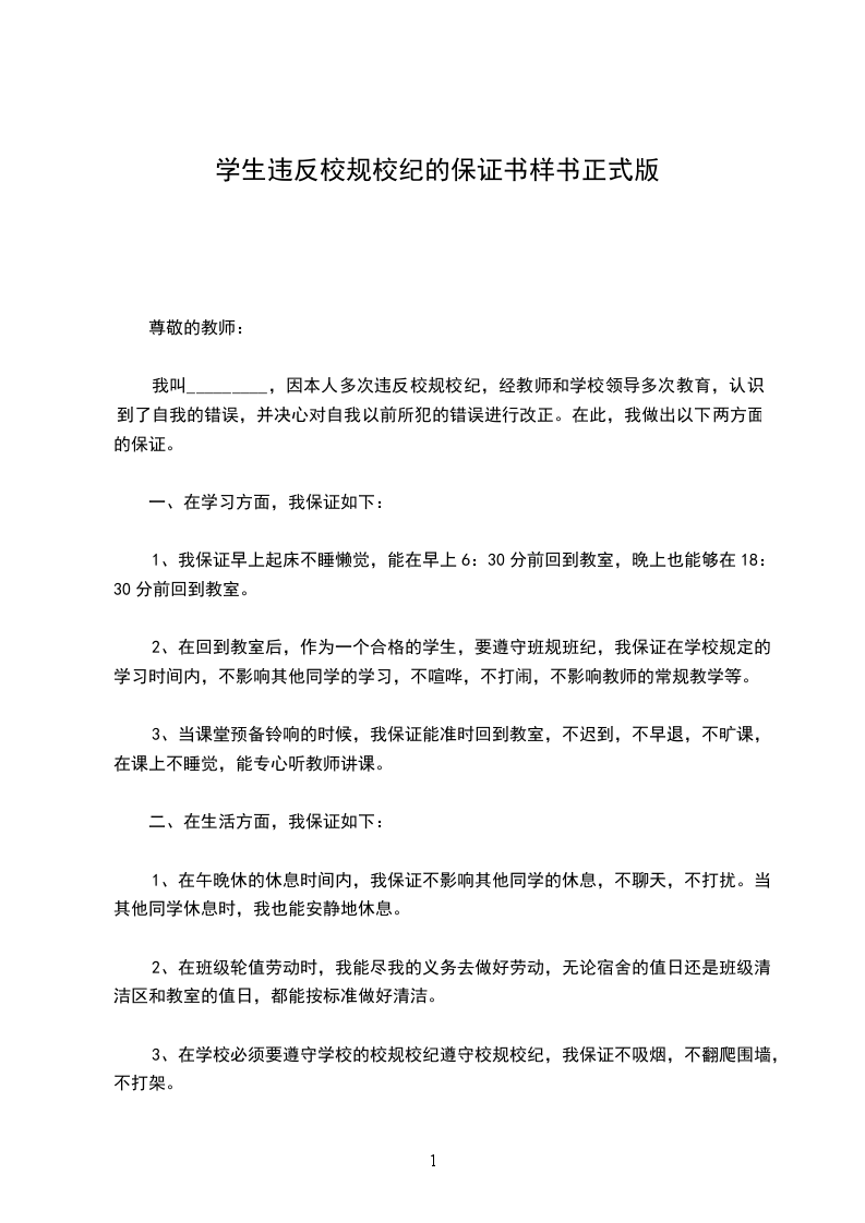 我叫________,因本人多次违反校规校纪,经老师和学校领导多次教育,认识到了自己的错误,并决心对自己以前所犯的错误进行改正。在此,我做出以下两方面的保证。