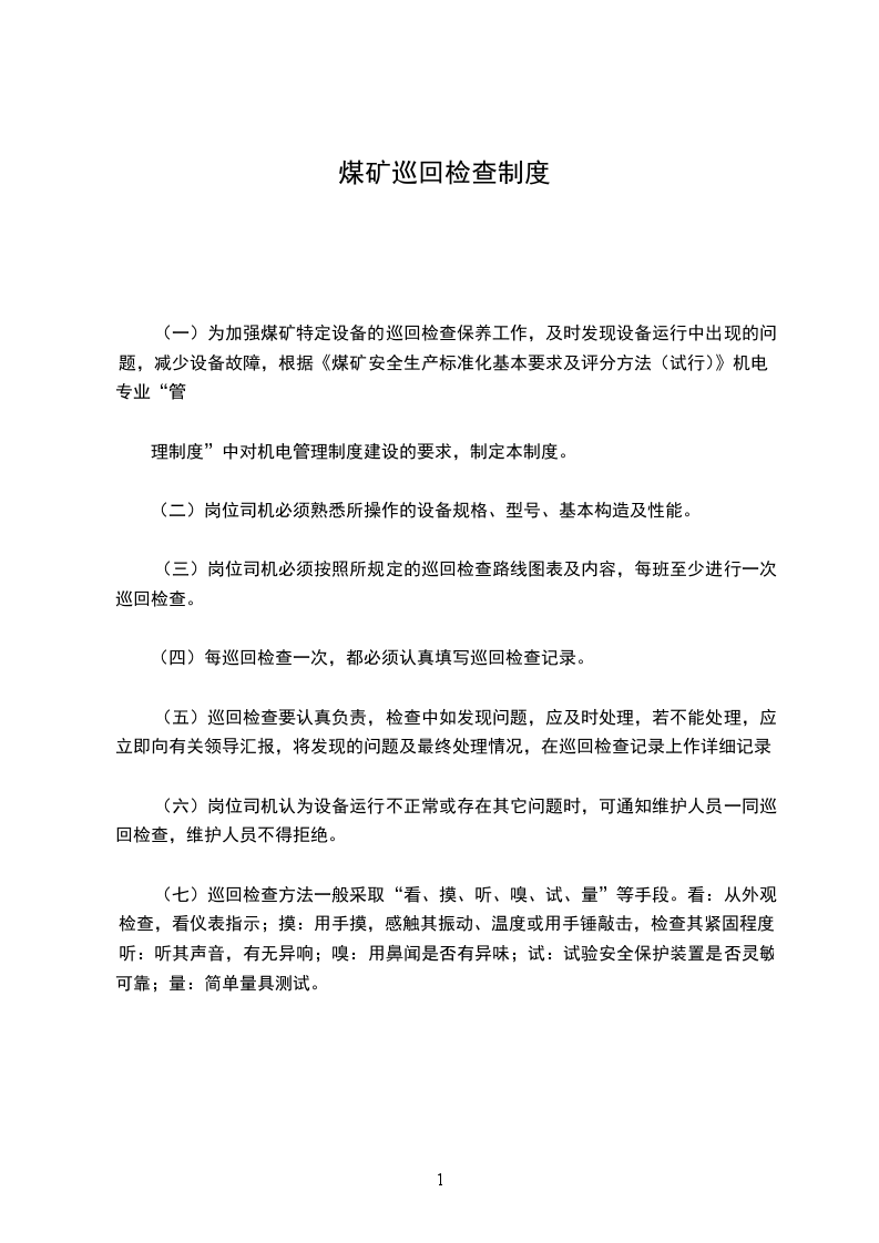 (一)为加强煤矿特定设备的巡回检查保养工作,及时发现设备运行中出现的问题,减少设备故障,根据《煤矿安全生产标准化基本要求及评分方法(试行)》机电专业“管