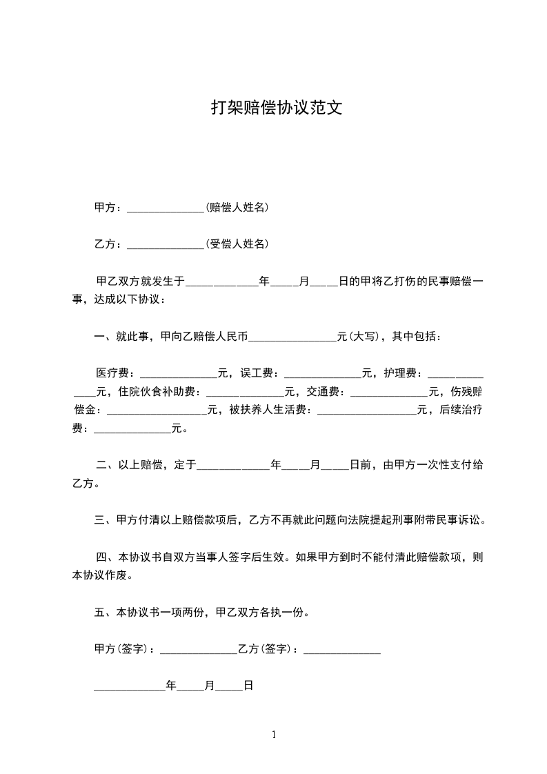 甲乙双方就发生于_____________年_____月_____日的甲将乙打伤的民事赔偿一事,达成以下协议: