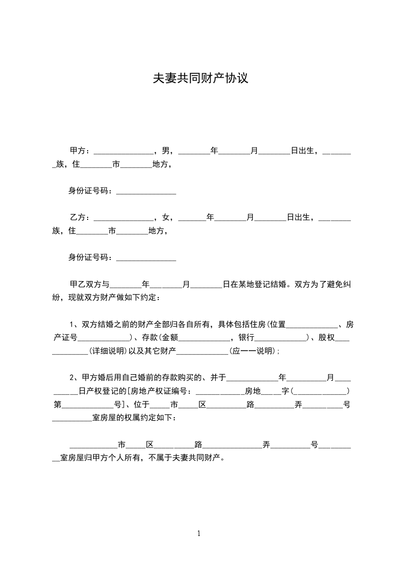____________市_____区__________路_______________弄__________号__________室房屋归甲方个人所有,不属于夫妻共同财产。