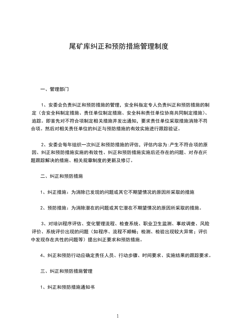 1、安委会负责纠正和预防措施的管理,安全科指定专人负责纠正和预防措施的制定(含安全科制定措施、责任单位制定措施、安全科和责任单位协商共同制定措施)、追踪。即首先对不符合项制定相关措施并发出通知,要求责任单位采取措施消除不符合项。然后对相关责任单位的纠正与预防措施的有效实施进行跟踪验证。