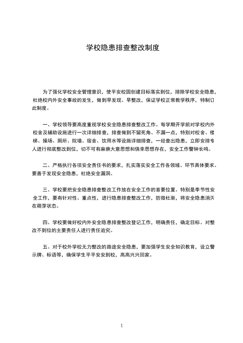 一、学校领导要高度重视学校安全隐患排查整改工作。每学期开学前对学校内外校舍及辅助设施进行一次详细排查,排查做到不留死角、不漏一点,特别对校舍、楼梯、操场、厕所、院墙、宿舍、饮用水等设施详细排查,一经查出隐患,立即安排专人进行彻底整改到位,切不可有麻痹大意思想和侥幸思想存在,安全工作警钟长鸣。