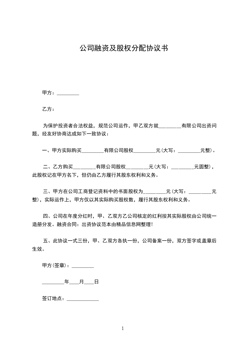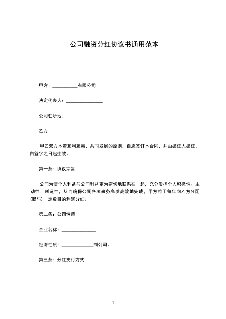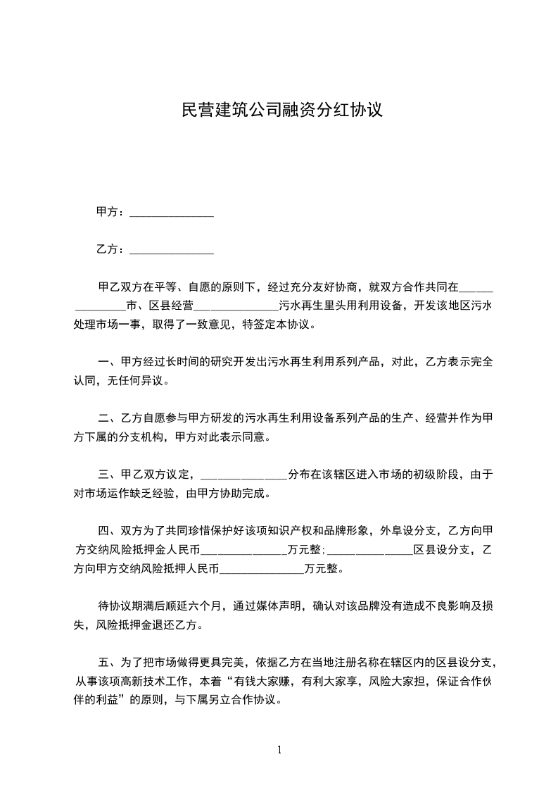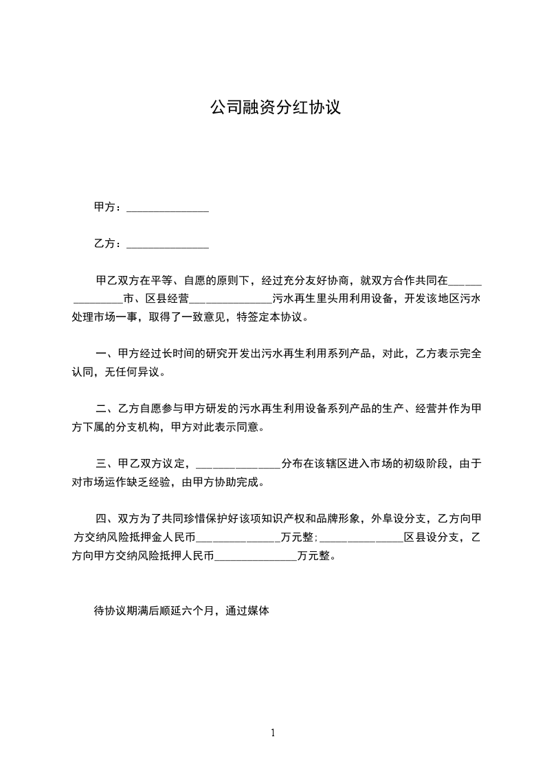 1、在公司经营活动中所得利润扣除各项开支,仍得以盈利的前提下,甲方从盈余中抽取______%的资金将对乙方予以分红。红利支付时间为每年的______月______日,以现金方式支付。