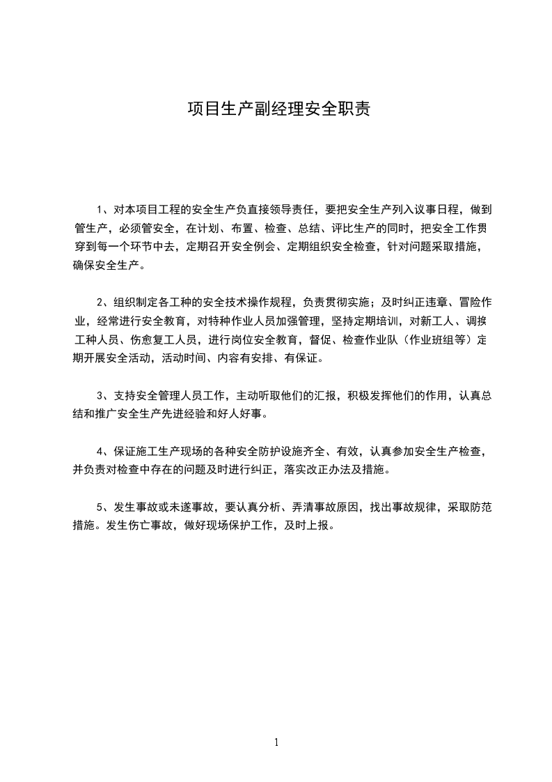 1、对本项目工程的安全生产负直接领导责任,要把安全生产列入议事日程,做到管生产,必须管安全,在计划、布置、检查、总结、评比生产的同时,把安全工作贯穿到每一个环节中去,定期召开安全例会、定期组织安全检查,针对问题采取措施,确保安全生产。