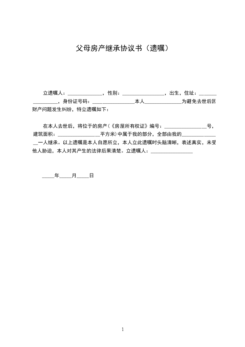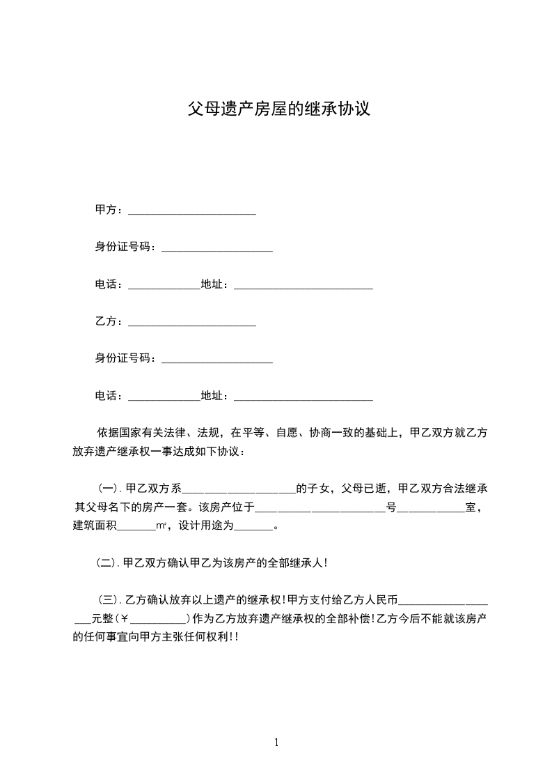 三、现有座落在_________省_________市_________路_________号宅院_________座,有住房_________间,铺面_________向,连院落共_________平方米,房地产权所有证_________号(由_________保管)。分配如下: