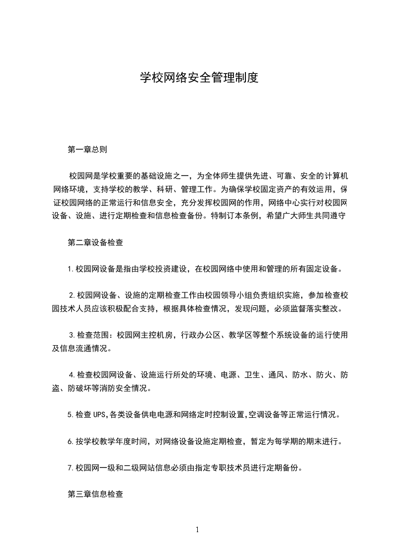 校园网是学校重要的基础设施之一,为全体师生提供先进、可靠、安全的计算机网络环境,支持学校的教学、科研、管理工作。为确保学校固定资产的有效运用,保证校园网络的正常运行和信息安全,充分发挥校园网的作用,网络中心实行对校园网设备、设施、进行定期检查和信息检查备份。特制订本条例,希望广大师生共同遵守。