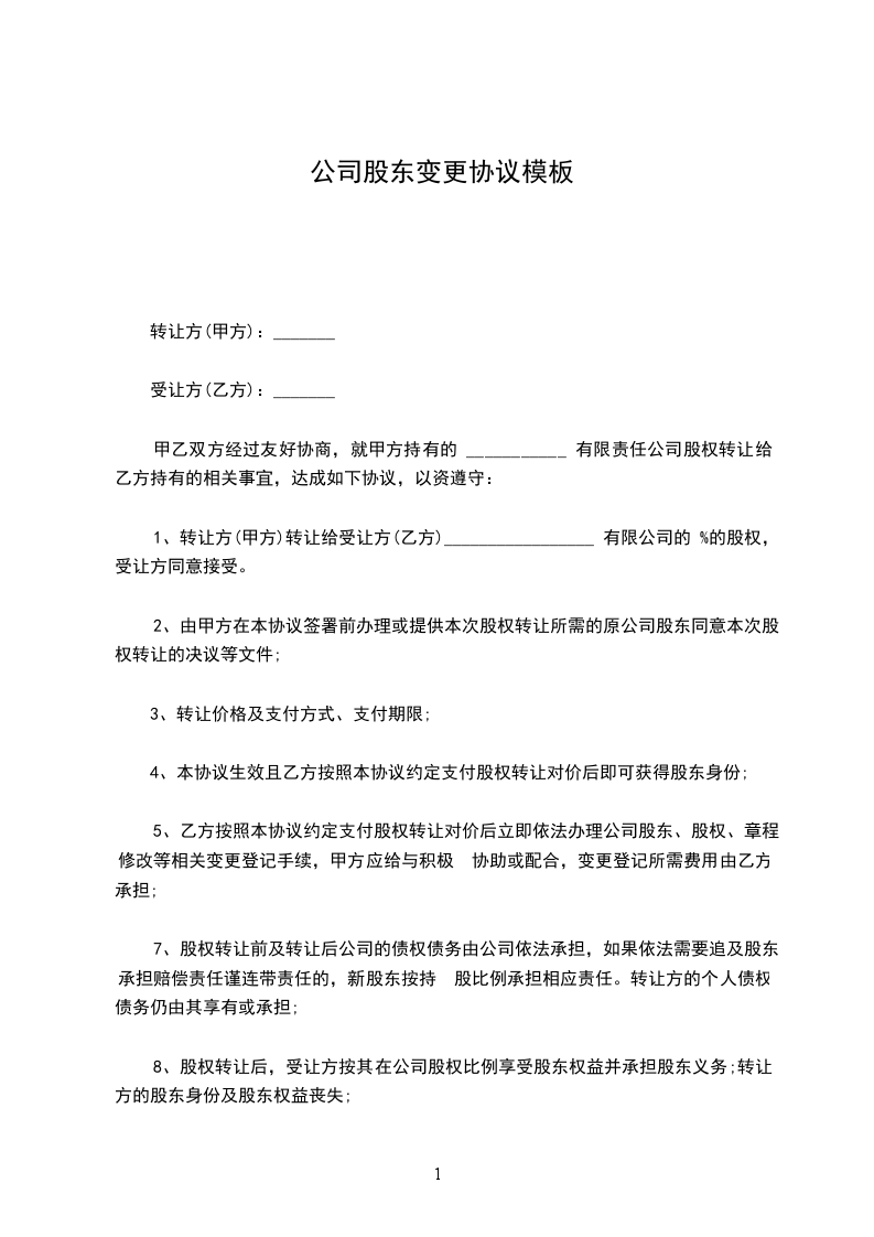 1、转让方(甲方)转让给受让方(乙方)_________________ 有限公司的 %的股权,受让方同意接受。
