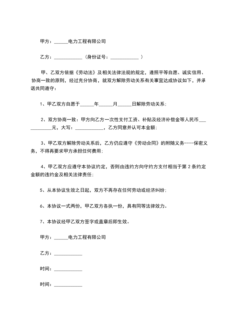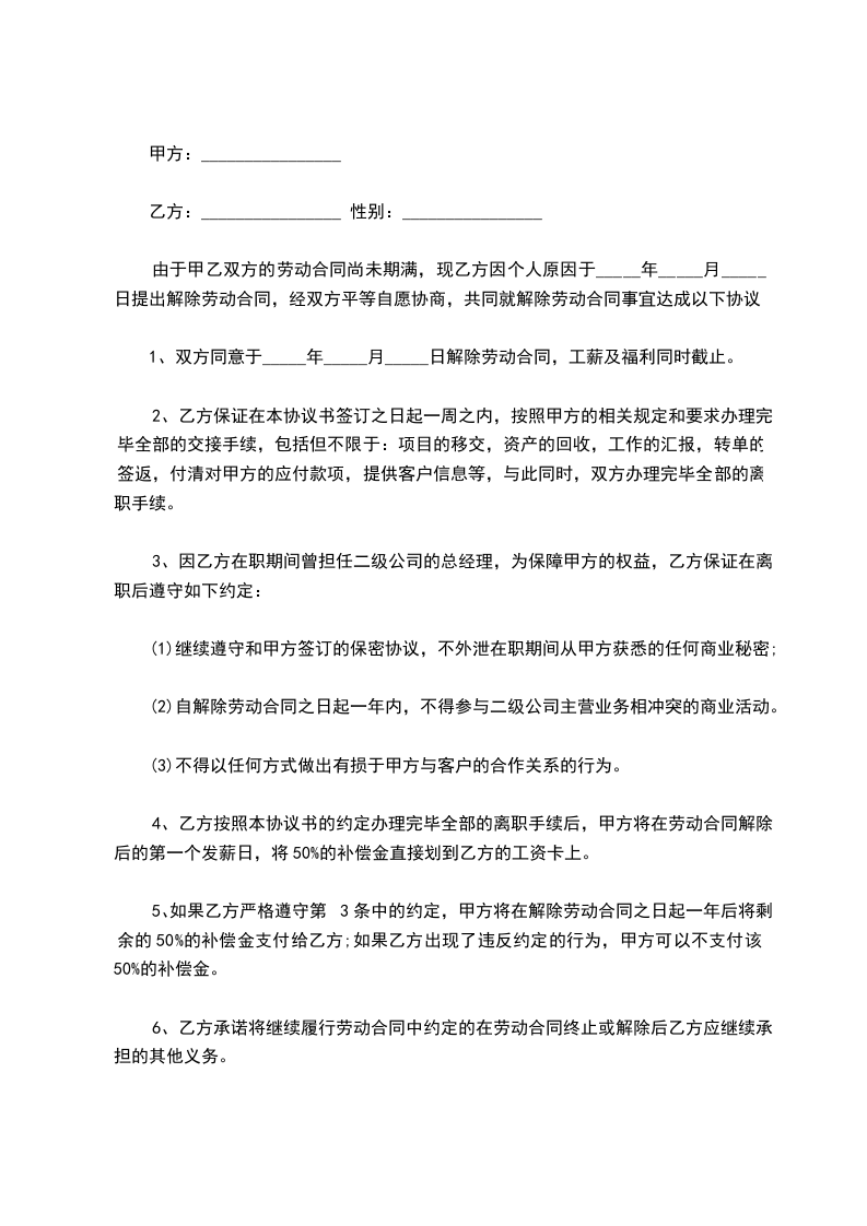 1、双方同意于_____年_____月_____日解除劳动合同,工薪及福利同时截止。