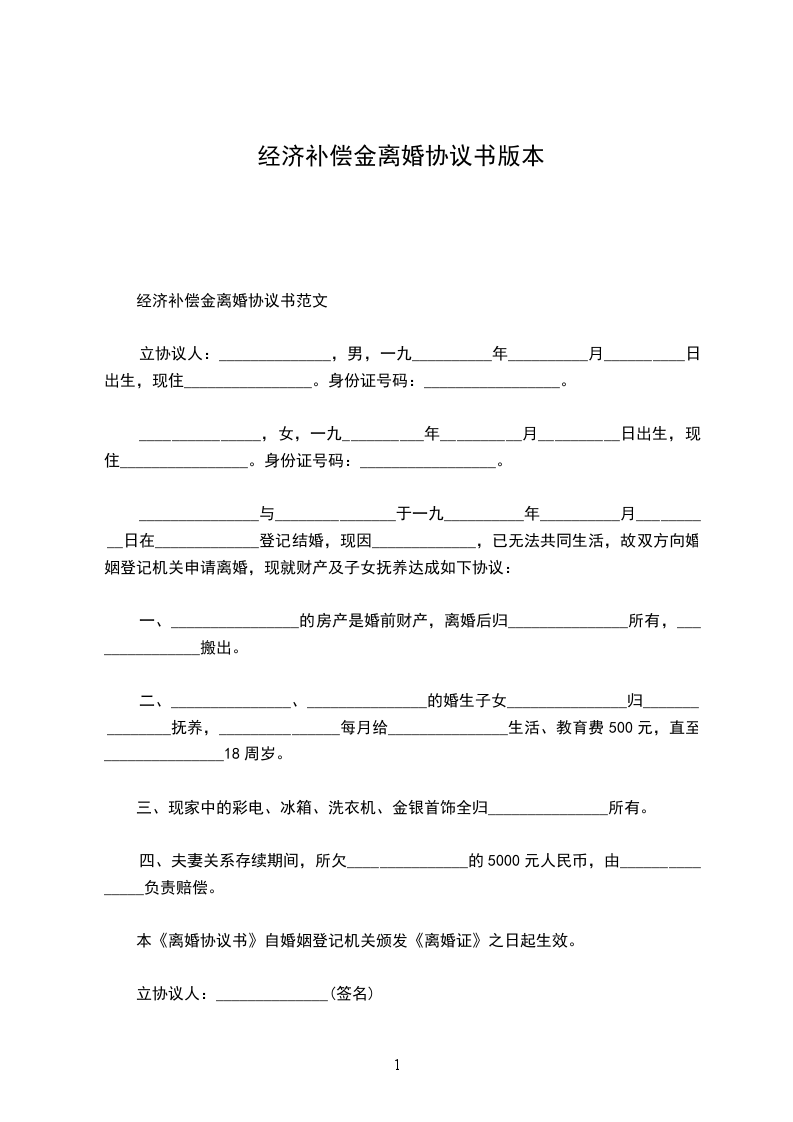 一、甲方同意支付乙方经济补偿金,同时自本协议生效之日起,甲方应于________年________月________日前,支付乙方因甲、乙双方协商一致,解除劳动、保险关系的经济补偿金。