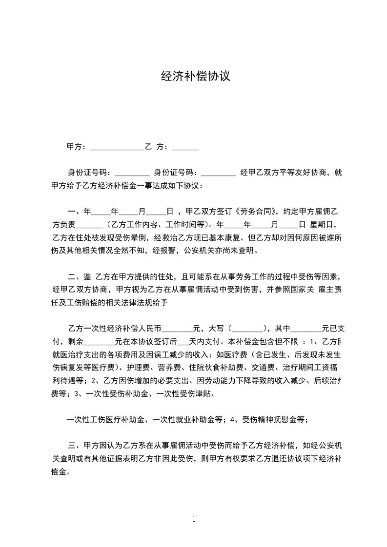 乙方身份证号:_______________,________年________月________日应聘进入甲方公司任一职;于________年________月________日时,甲方与乙方协商一致,解除劳动关系,就甲方按照乙方工龄支付乙方经济补偿金一事上,现甲、乙双方基于平等、自愿的立场上,双方协商一致,达成协议如下: