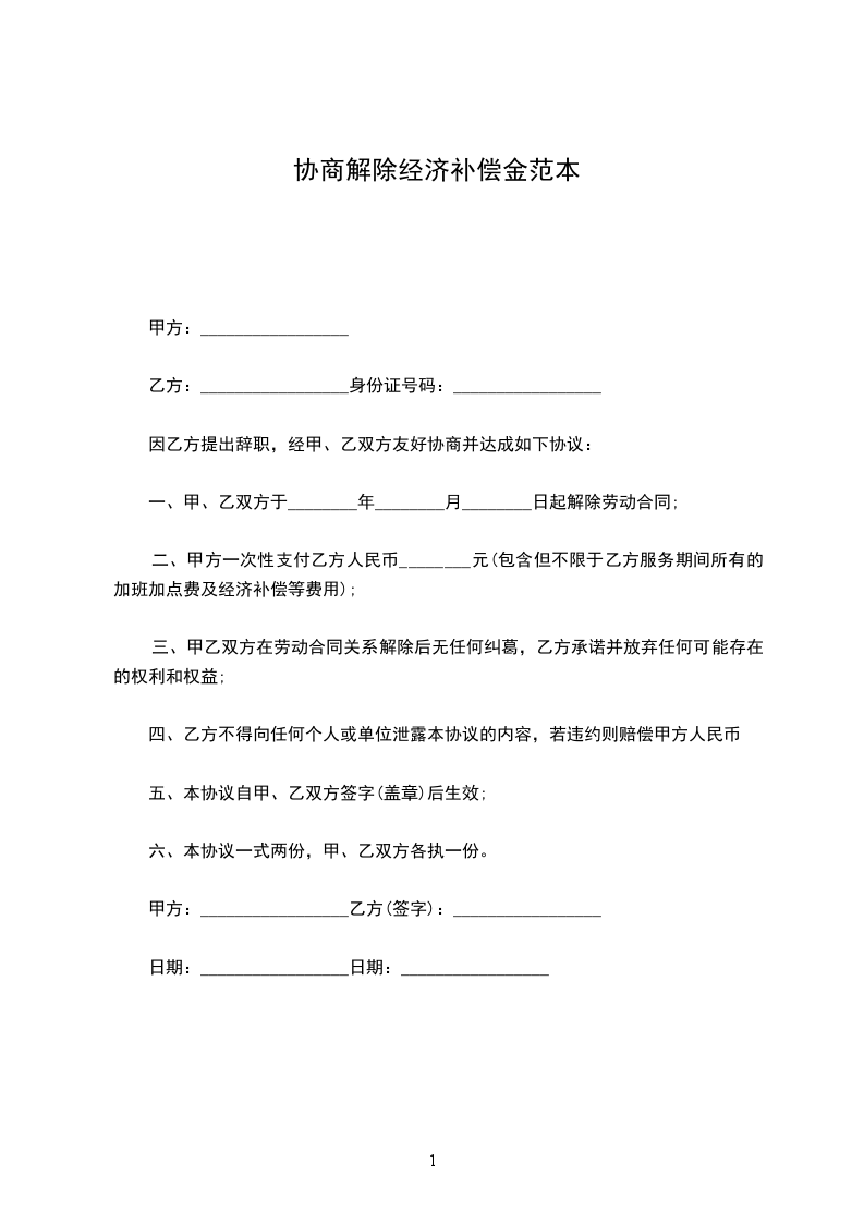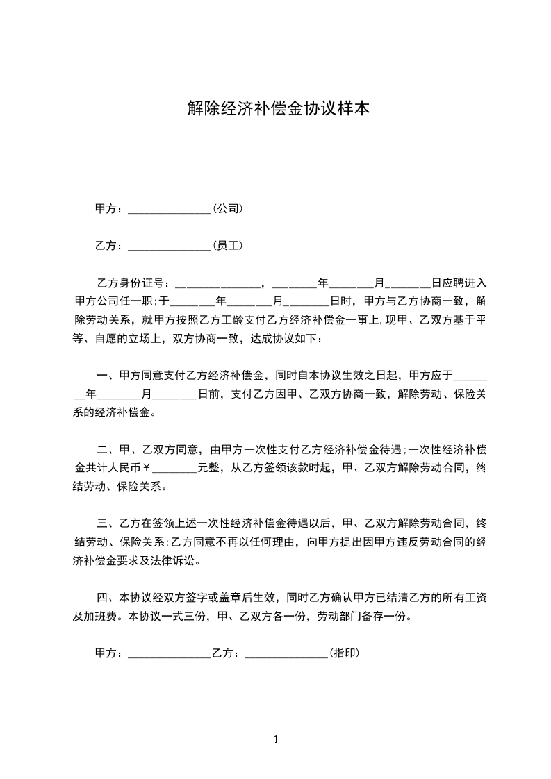 二、甲、乙双方同意,由甲方一次性支付乙方经济补偿金待遇;一次性经济补偿金共计人民币¥______________元整,从乙方签领该款时起,甲、乙双方解除劳动合同,终结劳动、保险关系。