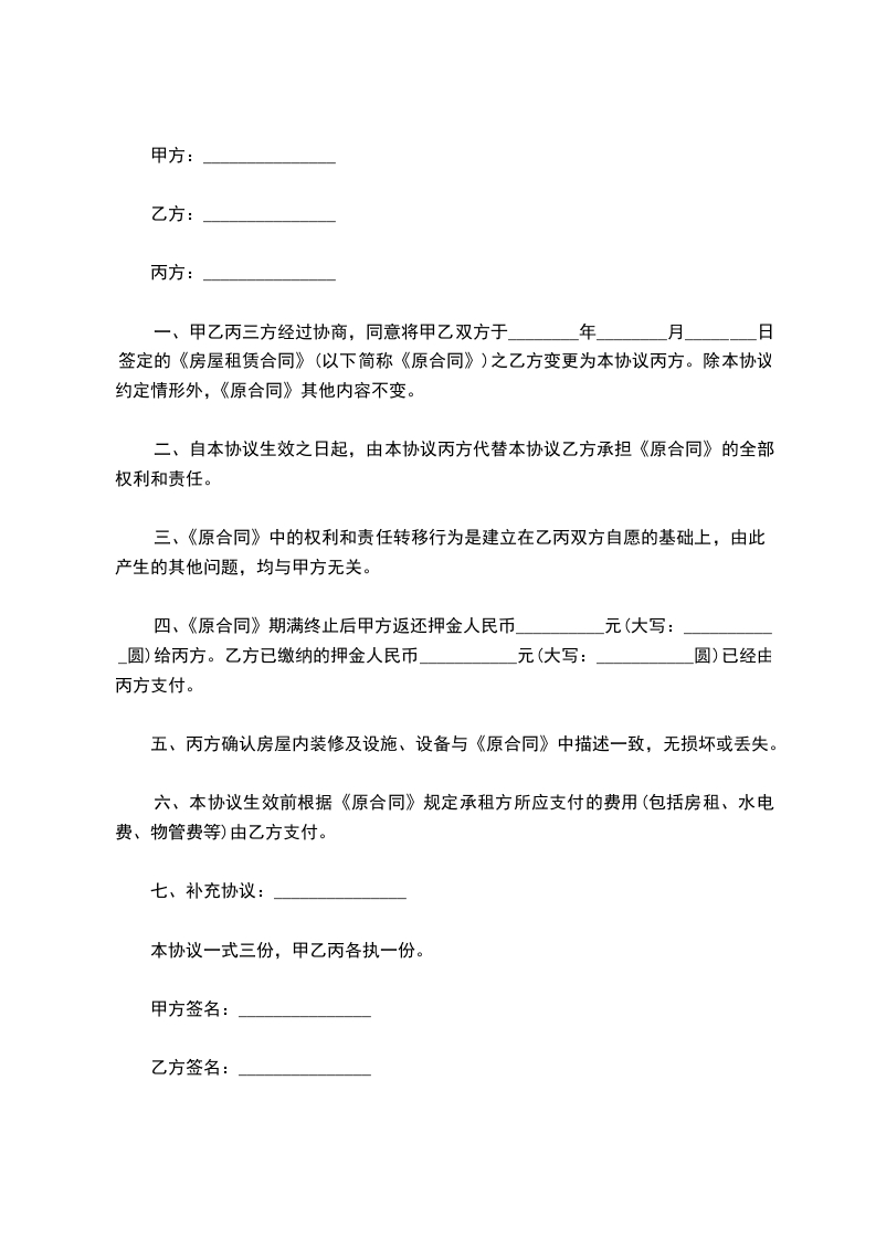 一、甲乙丙三方经过协商,同意将甲乙双方于________年________月________日签定的《房屋租赁合同》(以下简称《原合同》)之乙方变更为本协议丙方。除本协议约定情形外,《原合同》其他内容不变。