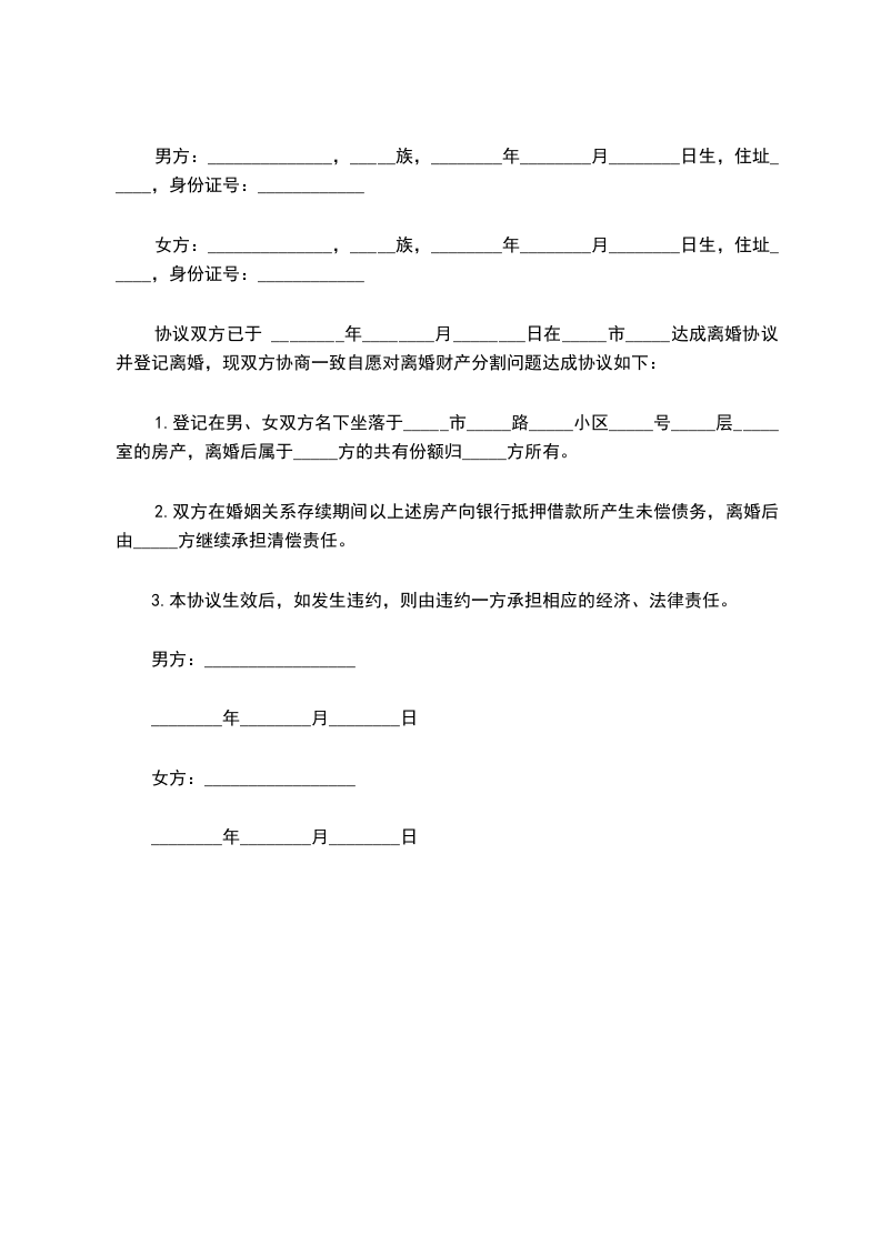 2.双方在婚姻关系存续期间以上述房产向银行抵押借款所产生未偿债务,离婚后由_____方继续承担清偿责任。