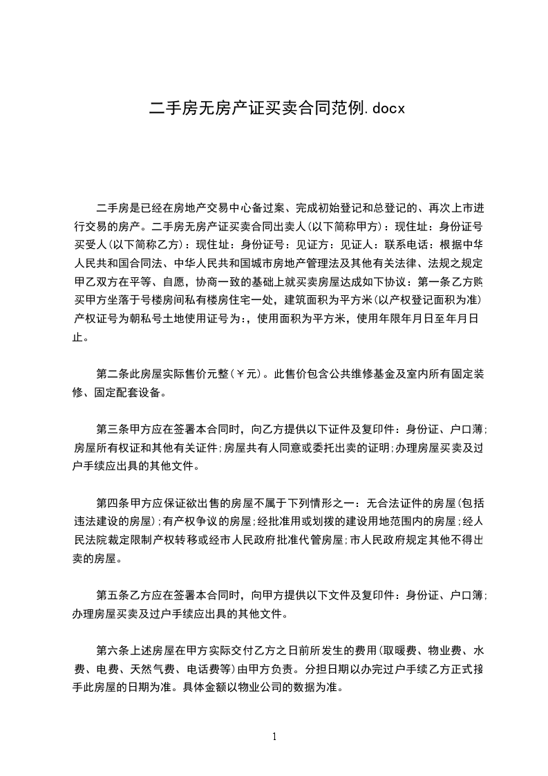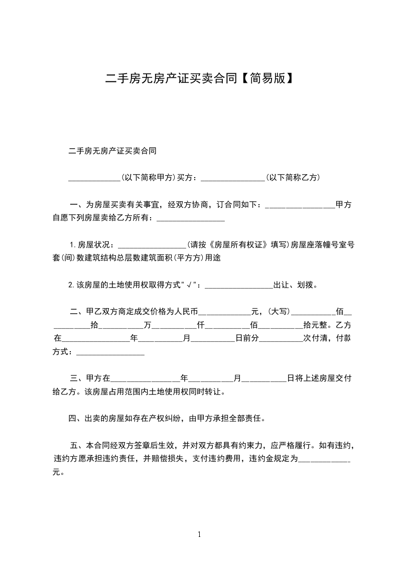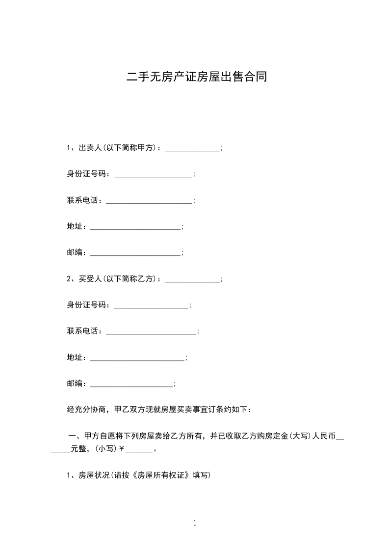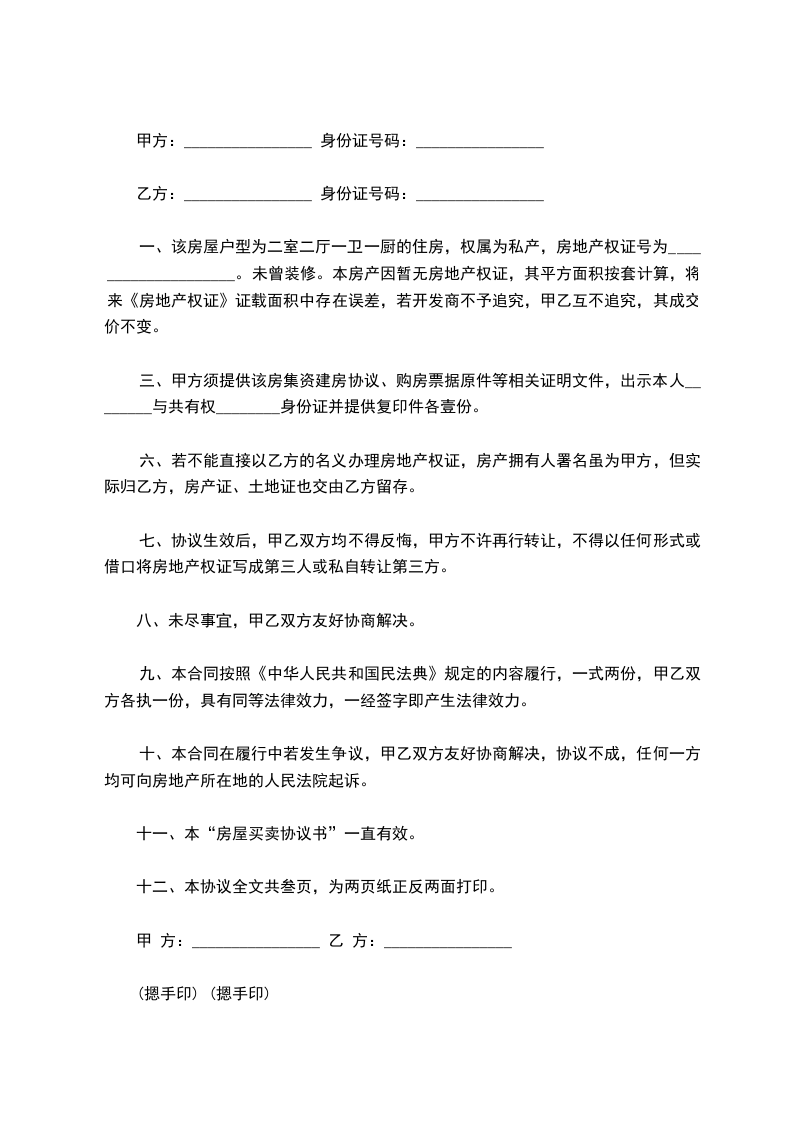 一、该房屋户型为二室二厅一卫一厨的住房,权属为私产,房地产权证号为____________________。未曾装修。本房产因暂无房地产权证,其平方面积按套计算,将来《房地产权证》证载面积中存在误差,若开发商不予追究,甲乙互不追究,其成交价不变。