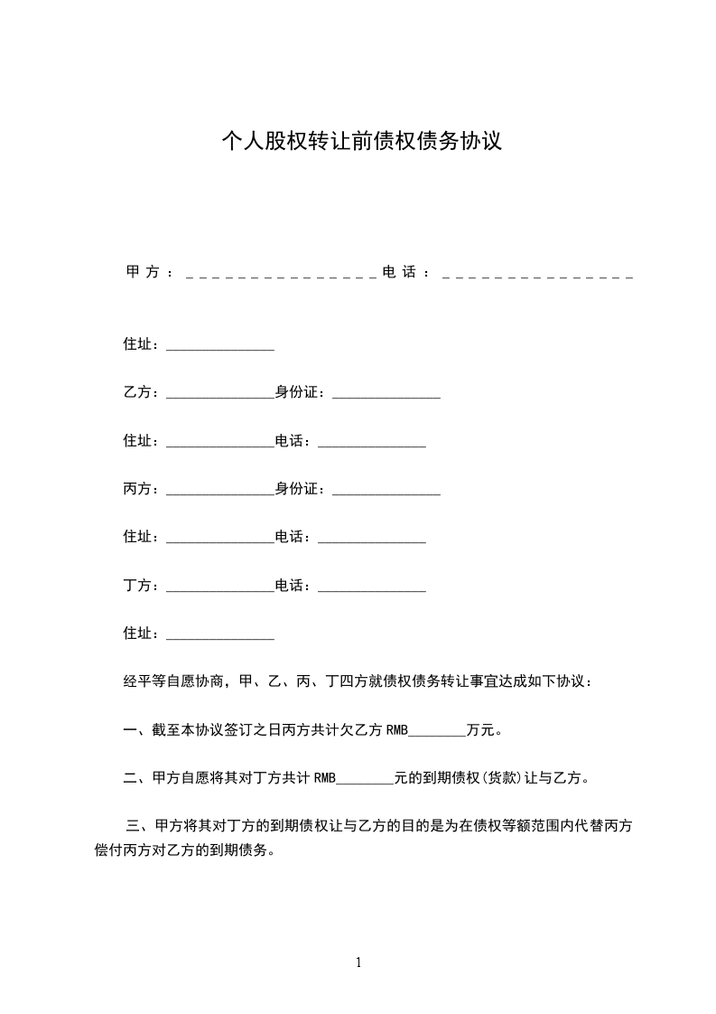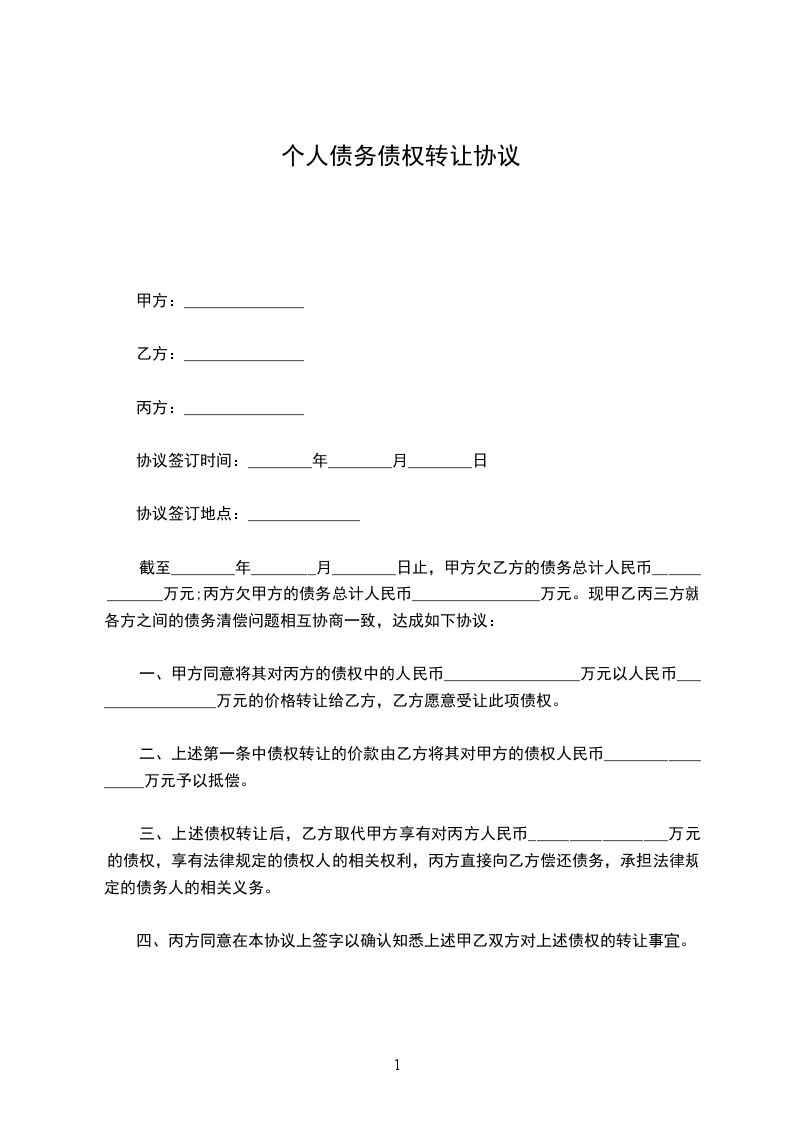 一、甲方同意将其对丙方的债权中的人民币_________________万元以人民币_________________万元的价格转让给乙方,乙方愿意受让此项债权。