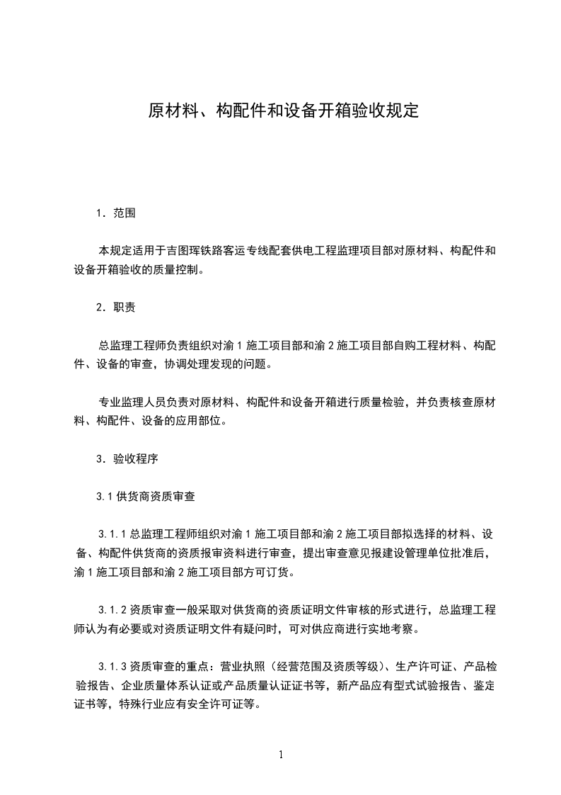 本规定适用于吉图珲铁路客运专线配套供电工程监理项目部对原材料、构配件和设备开箱验收的质量控制。