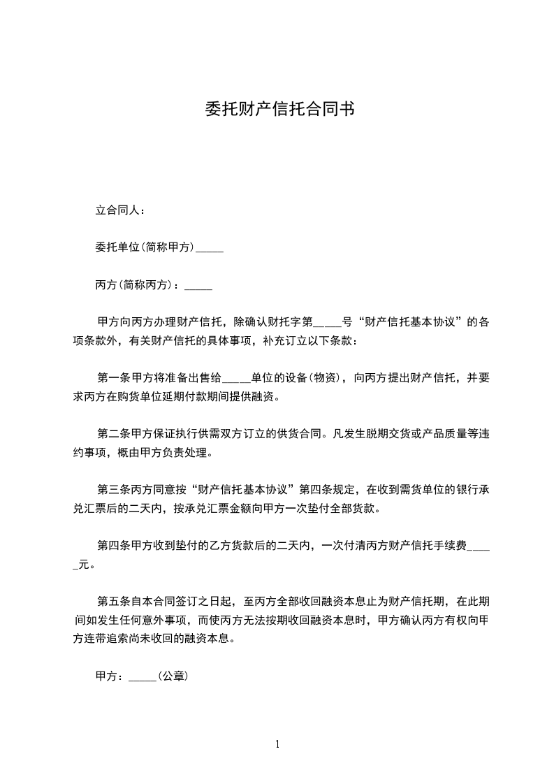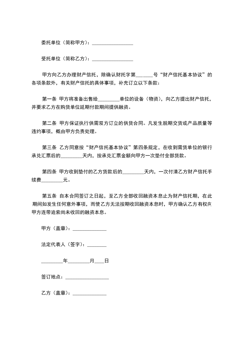 第一条 甲方将准备出售给_________单位的设备(物资),向乙方提出财产信托,并要求乙方在购货单位延期付款期间提供融资。