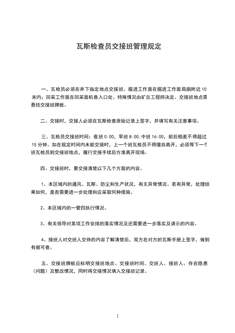 一、瓦检员必须在井下指定地点交接班。掘进工作面在掘进工作面局扇附近10米内;回采工作面在回采面机巷入口处。特殊情况由矿总工程师决定。交接班地点需悬挂交接班牌板。