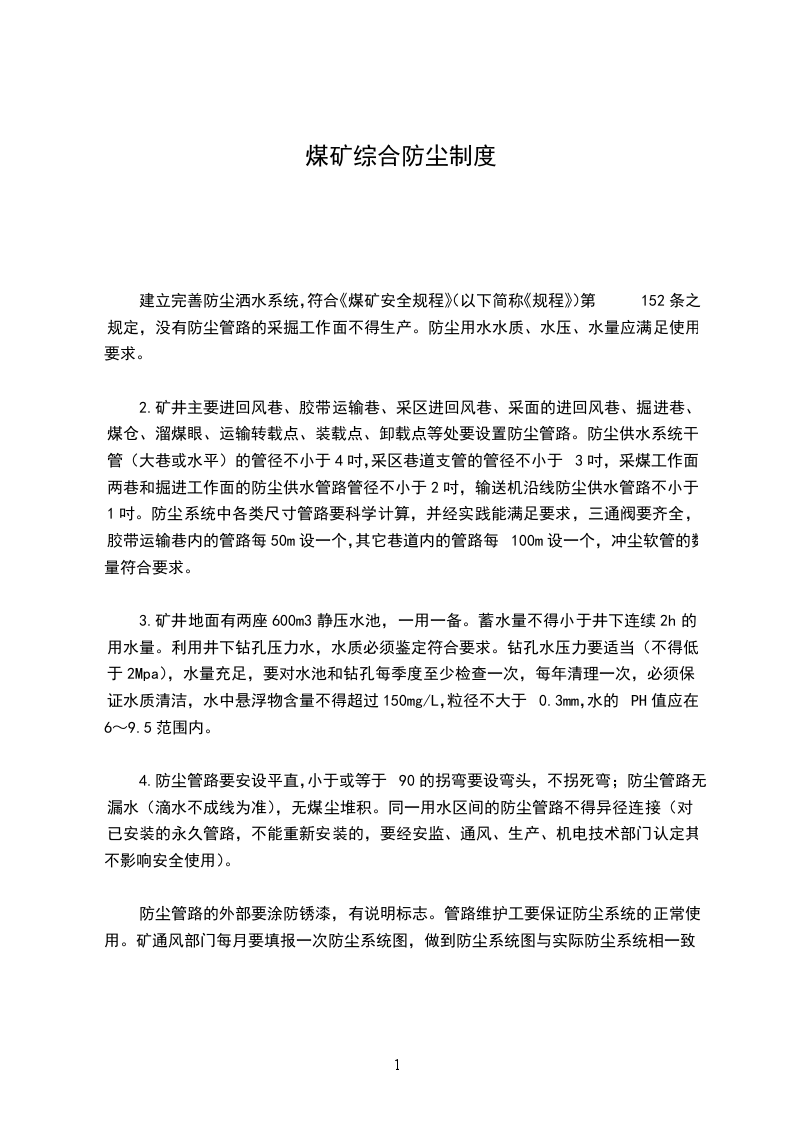 建立完善防尘洒水系统,符合《煤矿安全规程》(以下简称《规程》)第152条之规定,没有防尘管路的采掘工作面不得生产。防尘用水水质、水压、水量应满足使用要求。