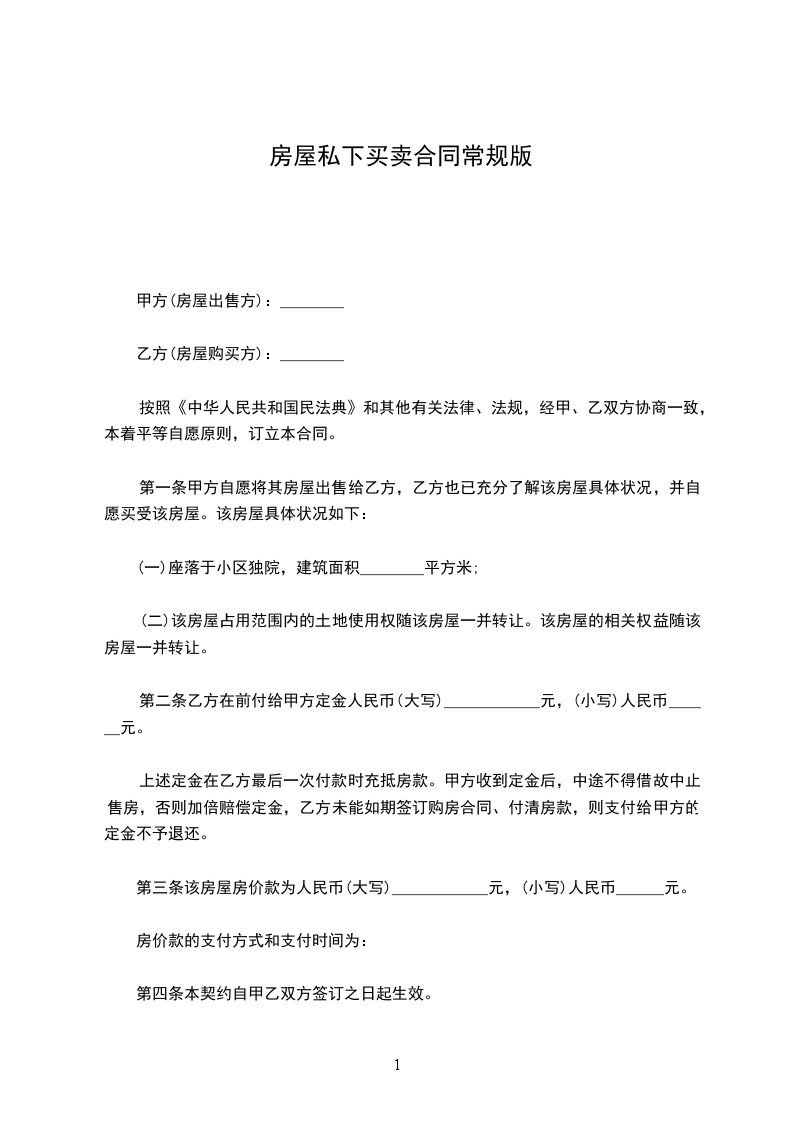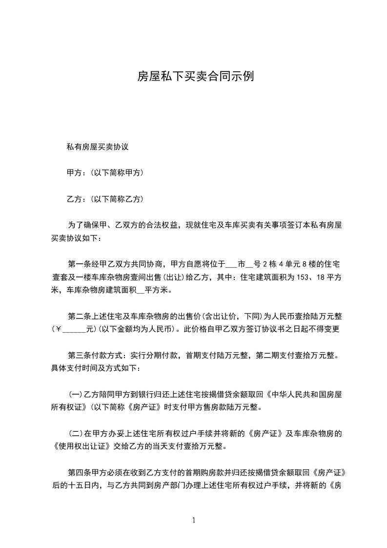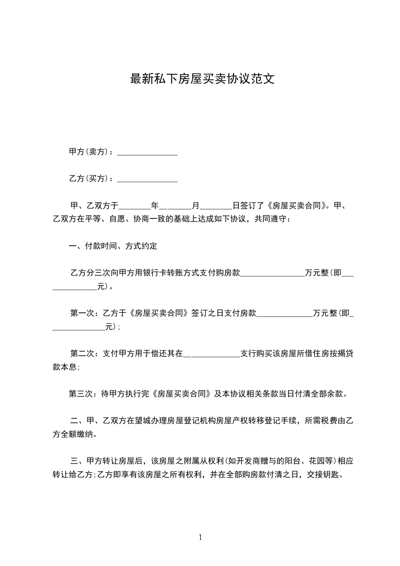 最新私下房屋买卖协议范文