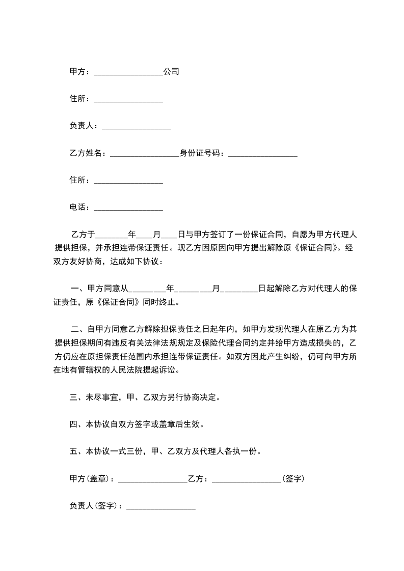 一、甲方同意从_________年_________月_________日起解除乙方对代理人的保证责任,原《保证合同》同时终止。