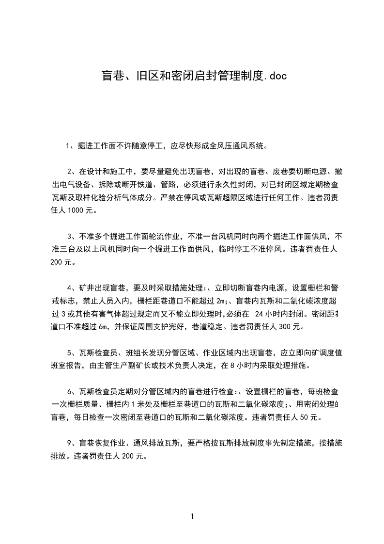(2)启封密闭前要做好排放瓦斯,恢复通风的准备工作,低瓦斯矿井或低瓦斯区的密闭,若确认盲巷内积聚的瓦斯浓度不超过3%,可由通风区制定措施,经矿总工程师审批后,进行启封。