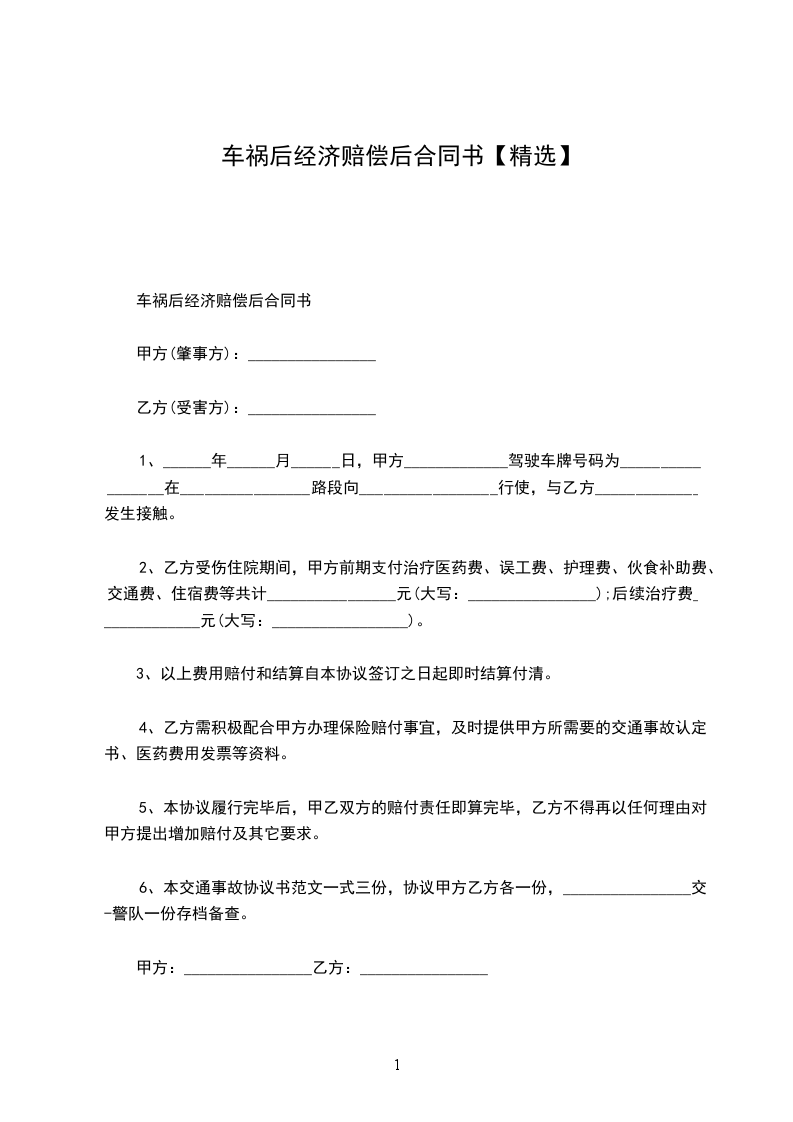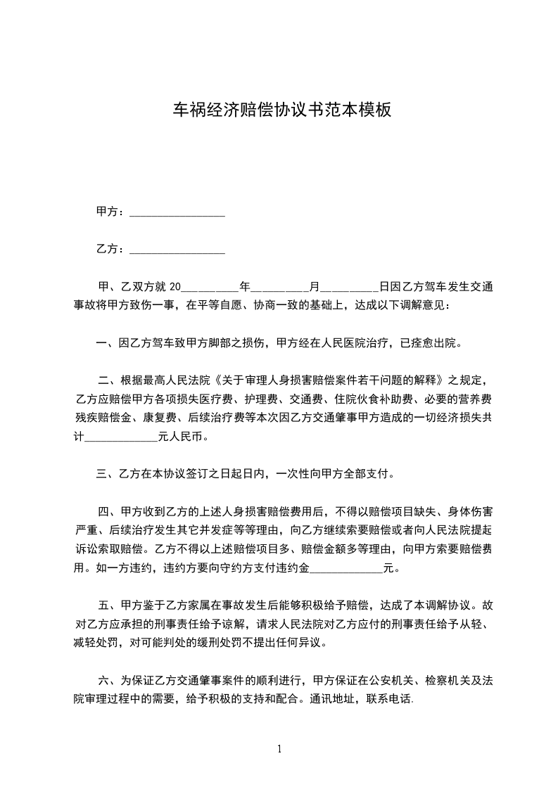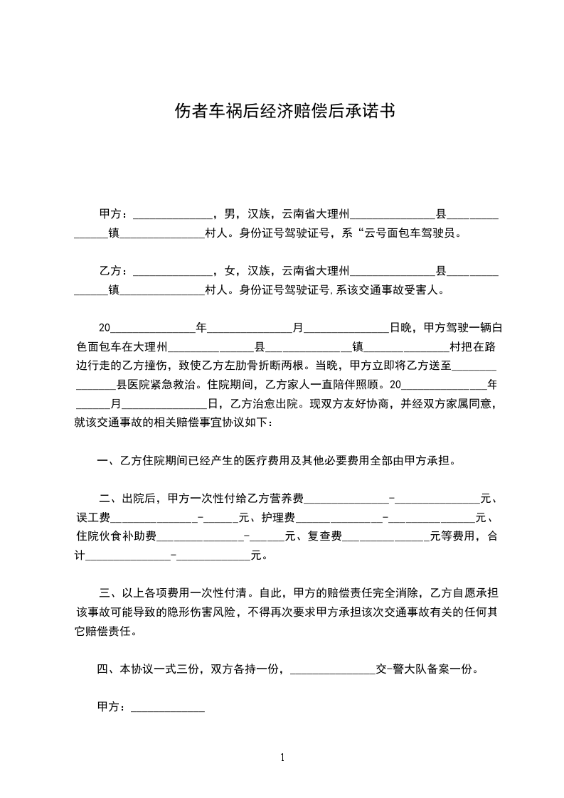 二、根据最高人民法院《关于审理人身损害赔偿案件若干问题的解释》之规定,乙方应赔偿甲方各项损失医疗费、护理费、交通费、住院伙食补助费、必要的营养费、残疾赔偿金、康复费、后续治疗费等本次因乙方交通肇事甲方造成的一切经济损失共计_____________元人民币。