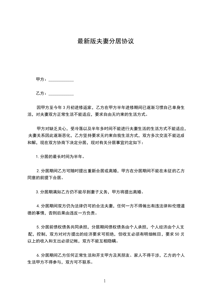 双方于_____________年__________月__________日在__________婚姻登记处办理结婚登记手续。_____________年__________月__________日生育子女__________。现双方就分居一事达成如下协议: