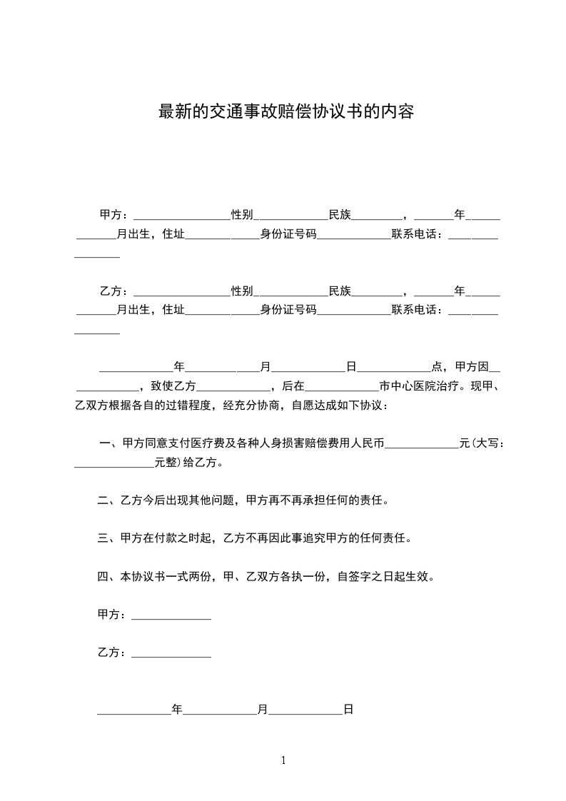 最新的交通事故赔偿协议书的内容