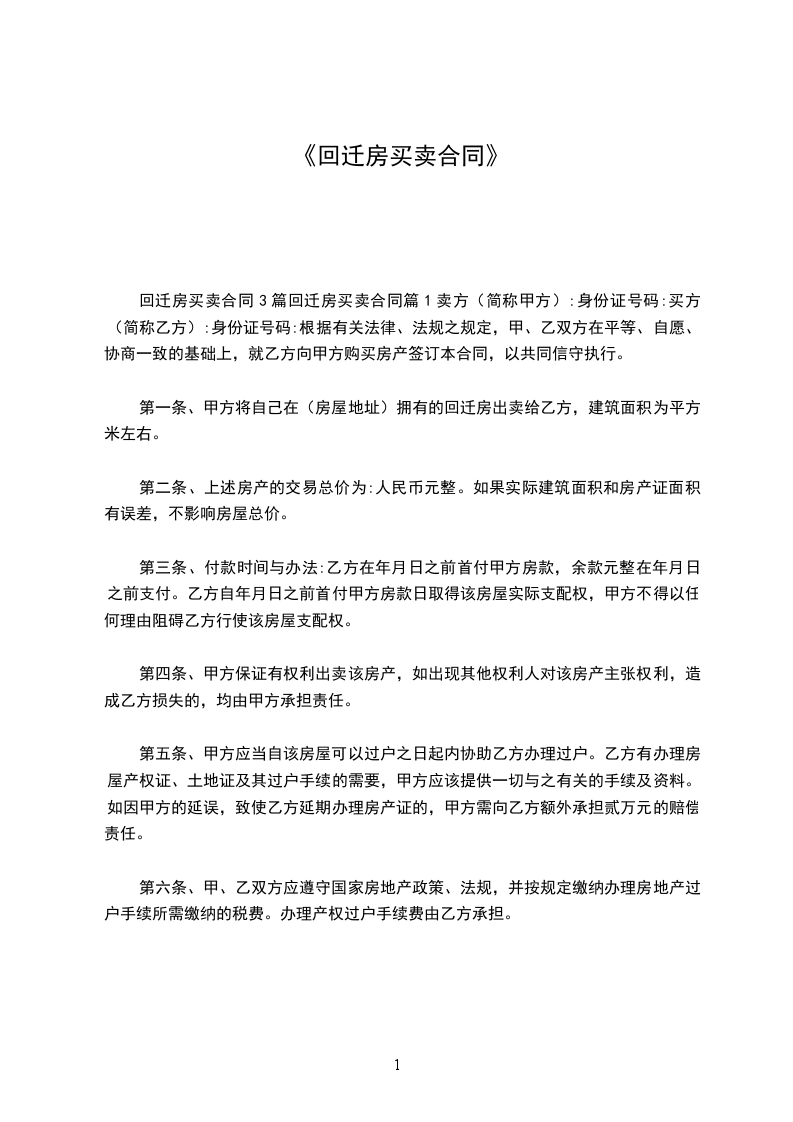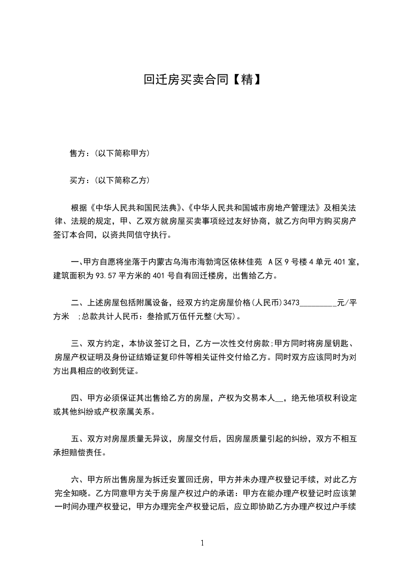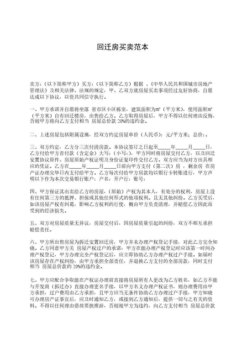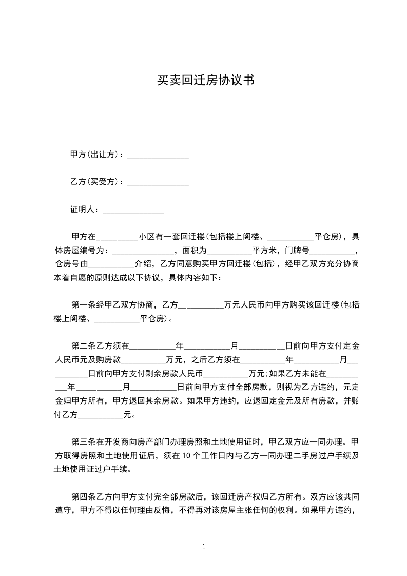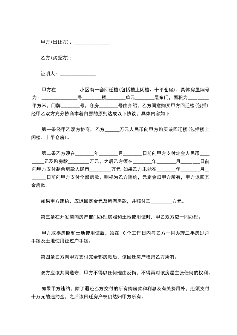 第一条经甲乙双方协商,乙方___________万元人民币向甲方购买该回迁楼(包括楼上阁楼、___________平仓房)。